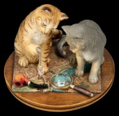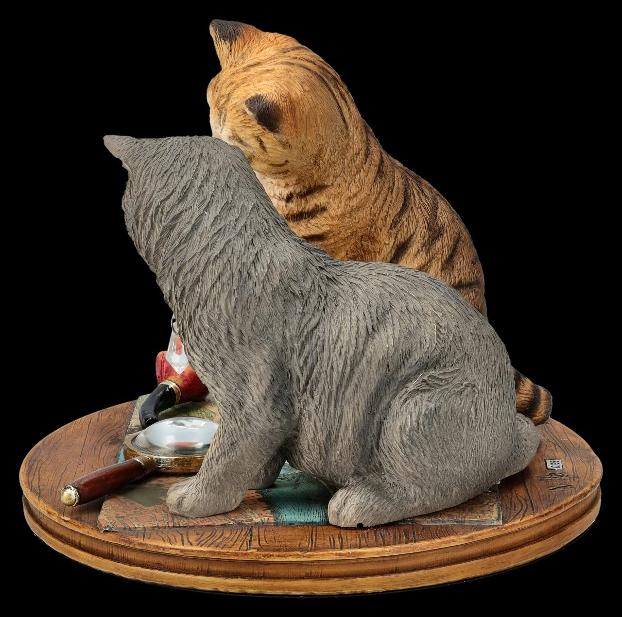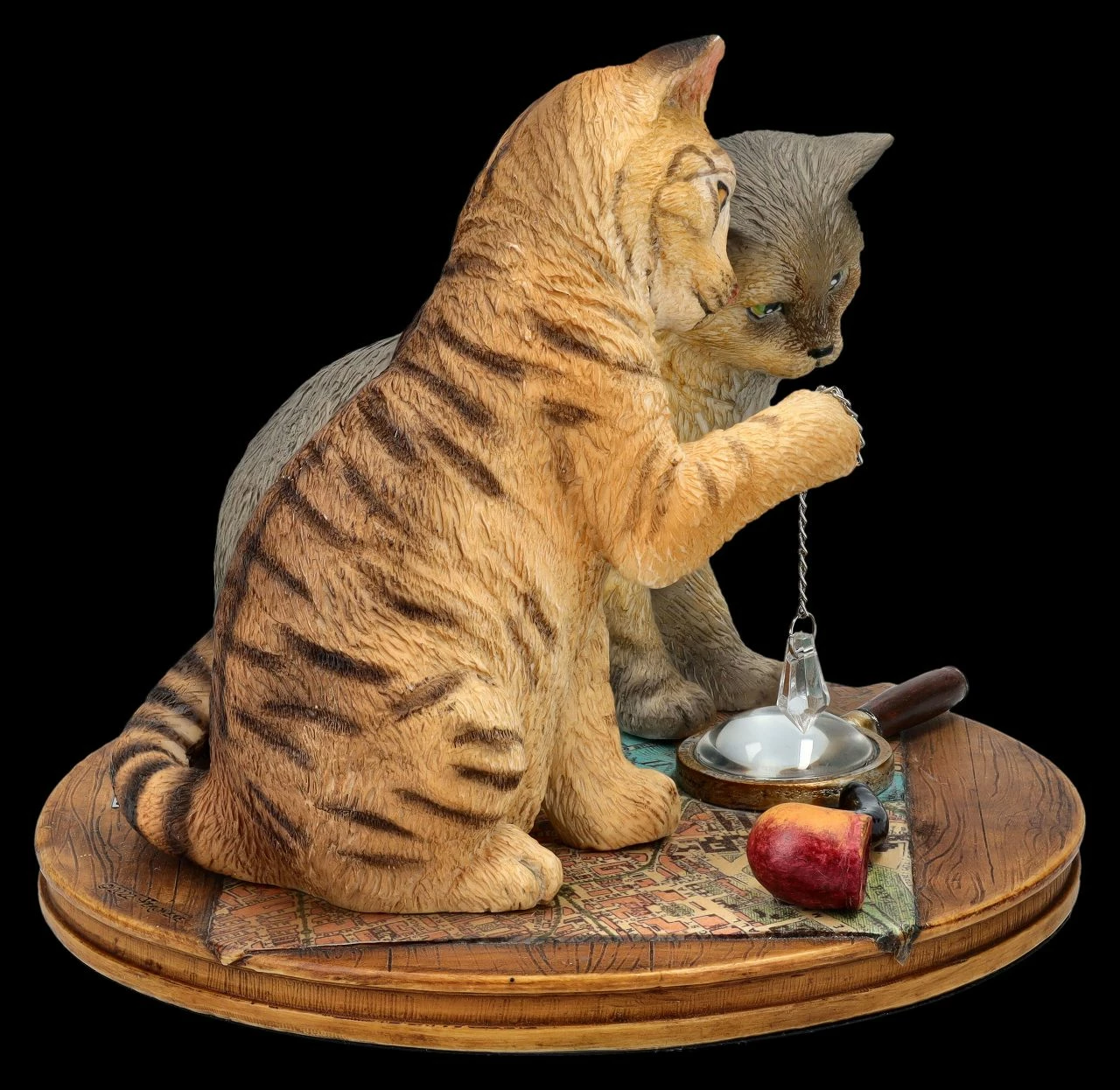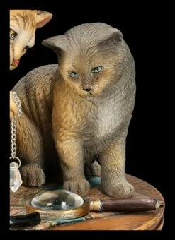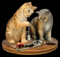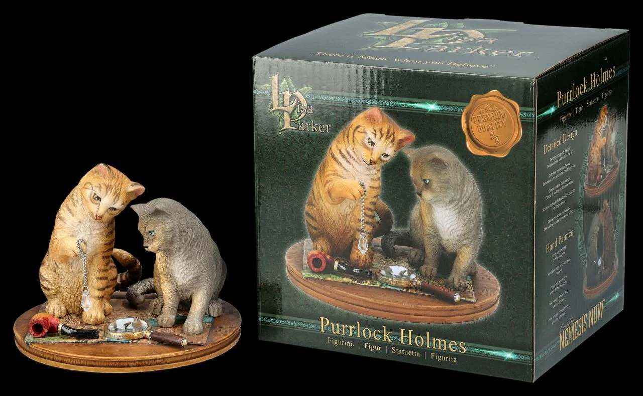 Wenn Mister Holmes es nicht schafft, das Rätsel zu lösen, müssen wieder einmal seine beiden schlauen Katzen eingreifen. Der getigerte Kater Purrlock Holmes hält das Pendel über die auf dem Tisch liegende Karte, während ihn sein grauer Freund Watson interessiert beobachtet. Finden die beiden nun das geheime Versteck des Schurken? Da – zwischen der Pfeife und der Lupe von Mister Holmes bleibt das Pendel stehen. Schlaue Katzen! Die wunderschön gearbeitete und liebevoll handbemalte Katzen-Figur ‚Purrlock Holmes‘ der berühmten Fantasie-Künstlerin Lisa Parker ist aus hochwertigem Kunststein (Polyresin). Sie ist 10 cm hoch, 12 cm breit und 12 cm tief und kommt in einem schön bedruckten Geschenkkarton. Sie ist eine zauberhafte Deko und ein wunderbares Geschenk, das nicht nur allen Katzenfreunden große Freude bereiten wird.