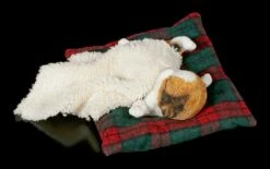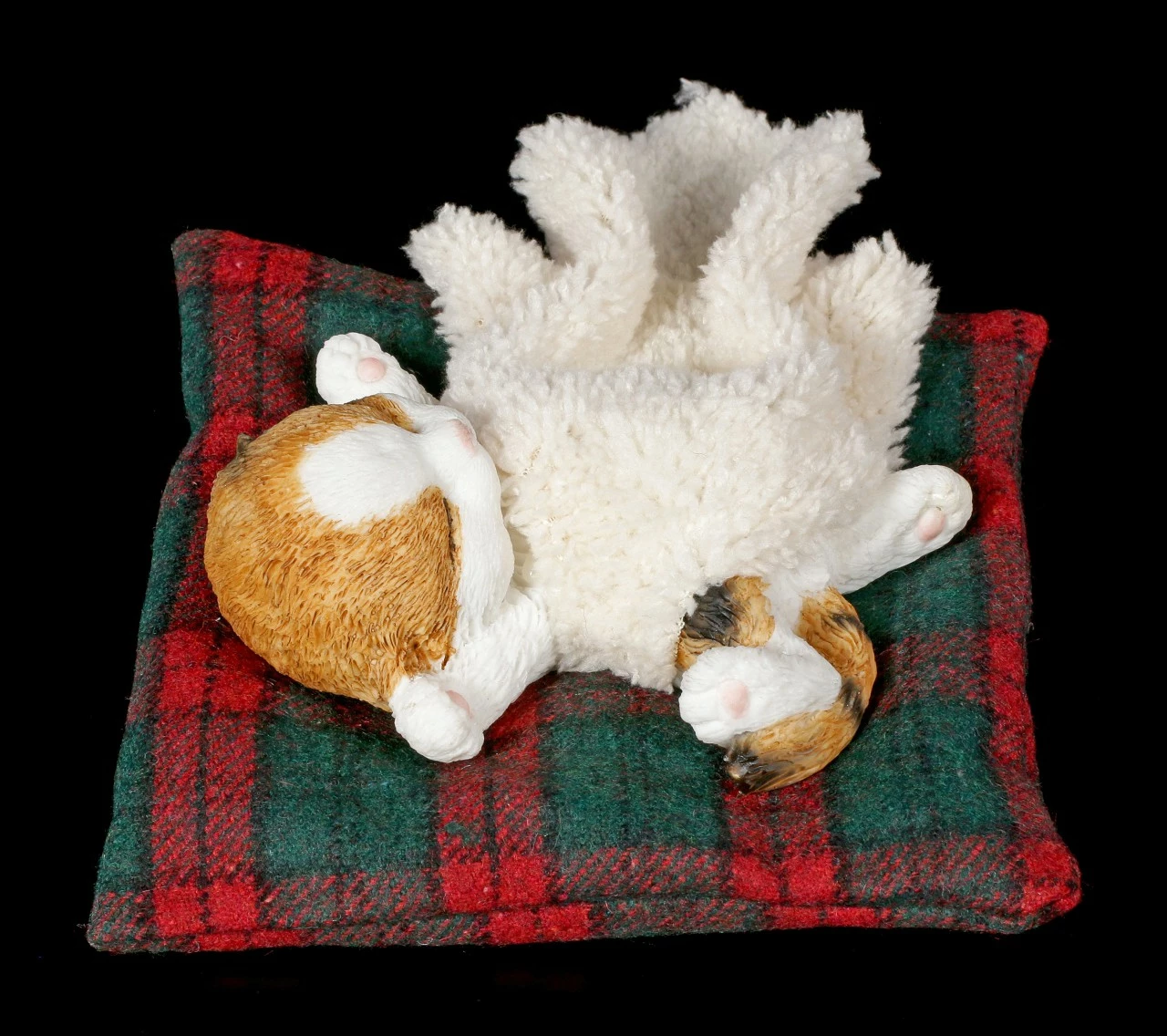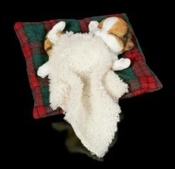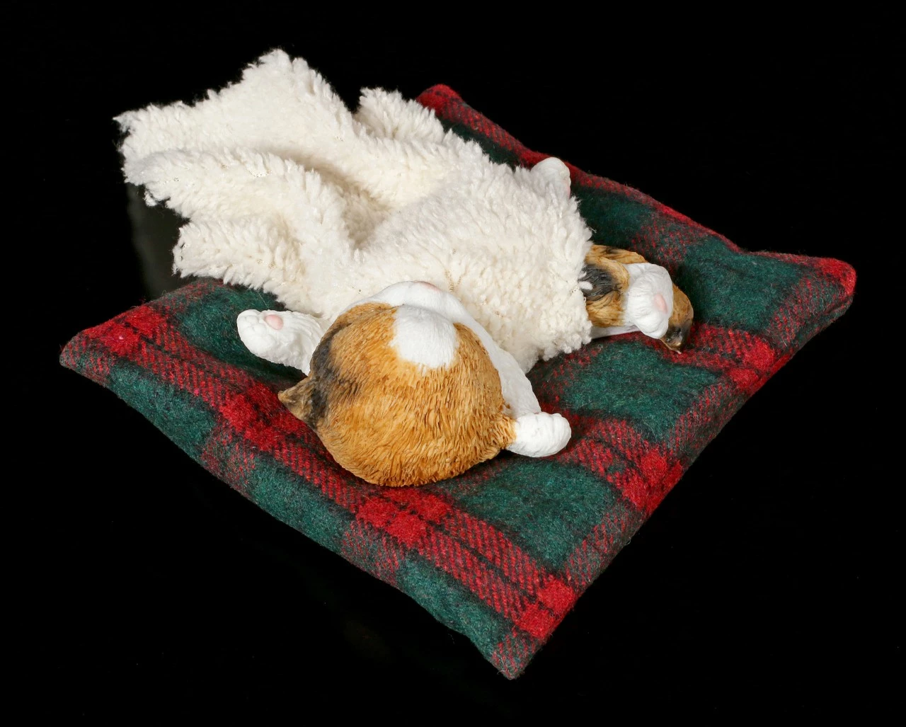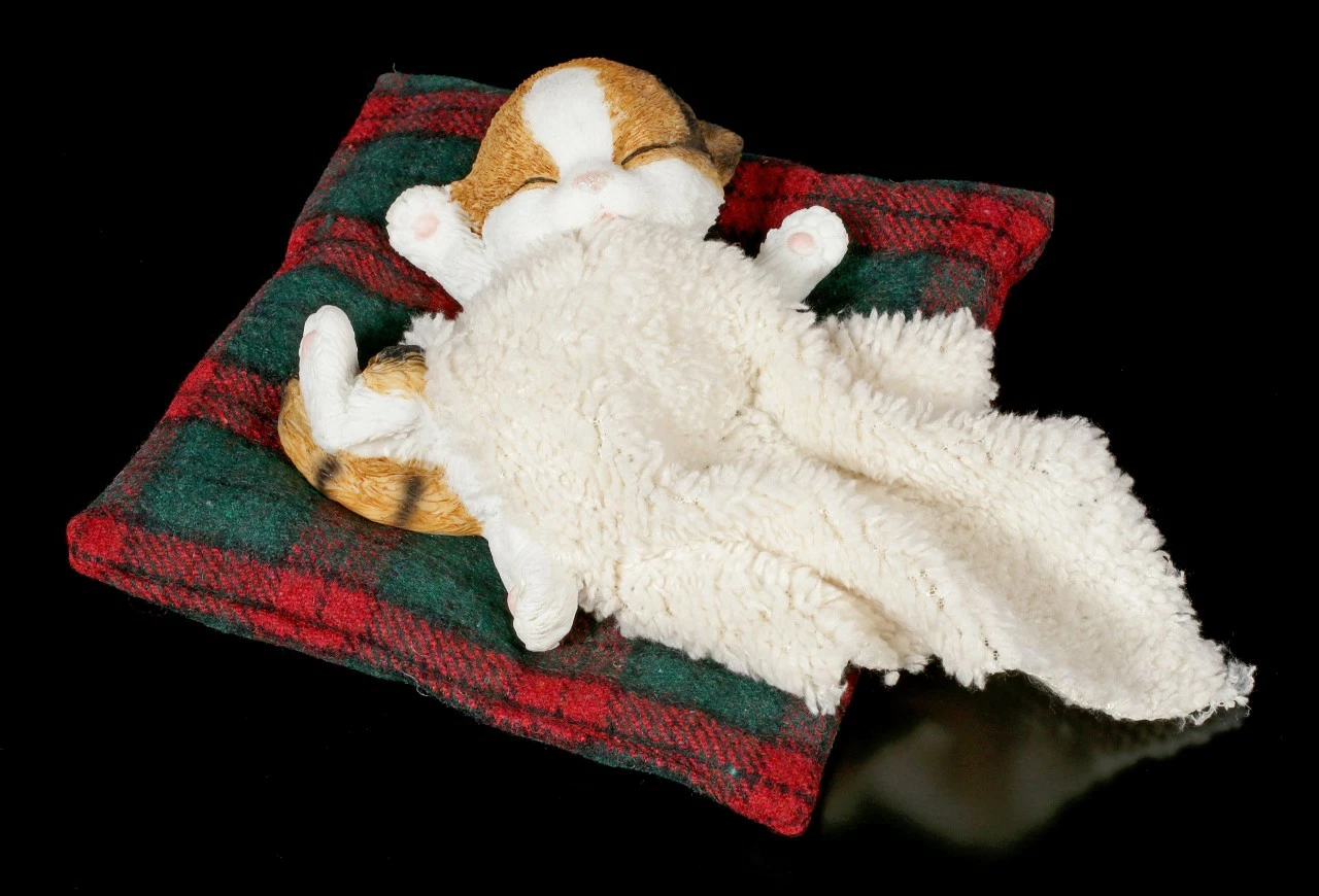Oh ist die süß! Ihre Besucher werden ganz hin und weg sein von der handbemalten Kunststein Figur. Das kleine rot-weiße Kätzchen hat es sich auf dem Kissen und unter der Decke bequem gemacht. Ob sie vom Spielen träumt?