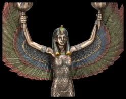 Wunderschön und edel ist dieser Kerzenhalter aus der Studio Collection von Veronese. In den hoch erhobenen Armen mit den großen Flügeln hält die ägyptische Göttin die Halterungen für zwei Kerzen. Die bronzierte und fein colorierte Figur der Ägyptischen Göttin sieht so wunderbar aus, wie man sie aus zahlreichen Darstellungen und Grabbeigaben kennt. Im alten Ägypten galt die geflügelte Göttin Isis als Schutzgöttin und als Muttergöttin, aber auch als Göttin der Magie. Der prächtige, 31 cm hohe, 23,5 cm breite und 10 cm tiefe Kerzenhalter ist sorgfältig und detailreich aus hochwertigem Kunststein (Polyresin) gefertigt. Ob auf einem Tisch oder auf dem Sideboard, dieser faszinierende Kerzenhalter mit der geflügelten ägyptischen Göttin wird überall zum sofortigen Blickfang und ist damit auch ein edles Geschenk. Die Lieferung erfolgt ohne Kerzen.