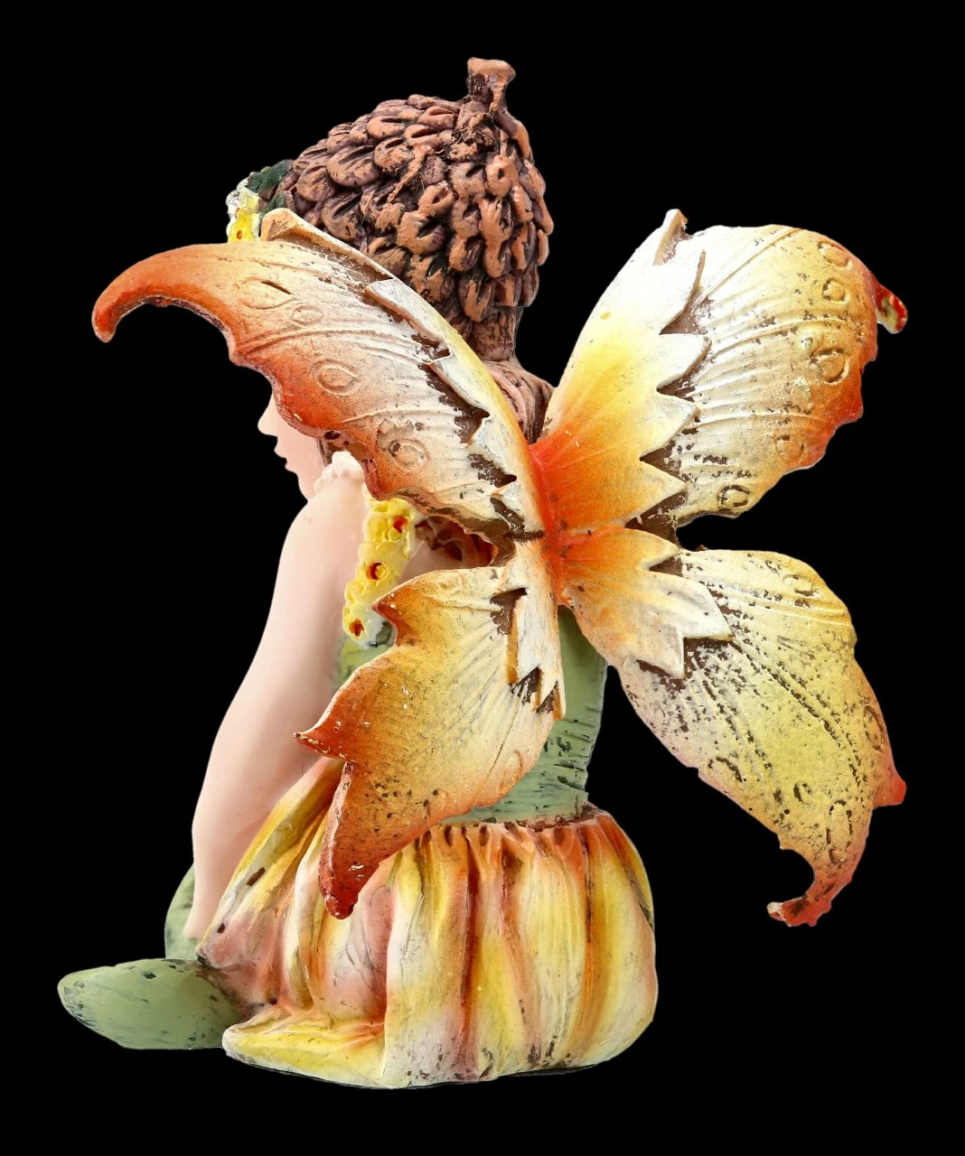 Irgendetwas scheint die niedliche kleine Elfe Lilly entdeckt zu haben. Vielleicht eine kleine Blüte, einen Käfer oder Schmetterling? Es sieht aus, als würde sie gerade vorsichtig danach fassen wollen. Die zarte Elfenfigur mit dem Zapfenhut und dem Blumenkranz im Haar ist aus liebevoll handbemaltem Kunststein (Polyresin) gefertigt. Die kleine Elfe Lilly ist 7,5 cm hoch, 7,5 cm breit und 6 cm tief. Lilly würde sich sehr über einen Platz zwischen Ihren Blumen freuen.