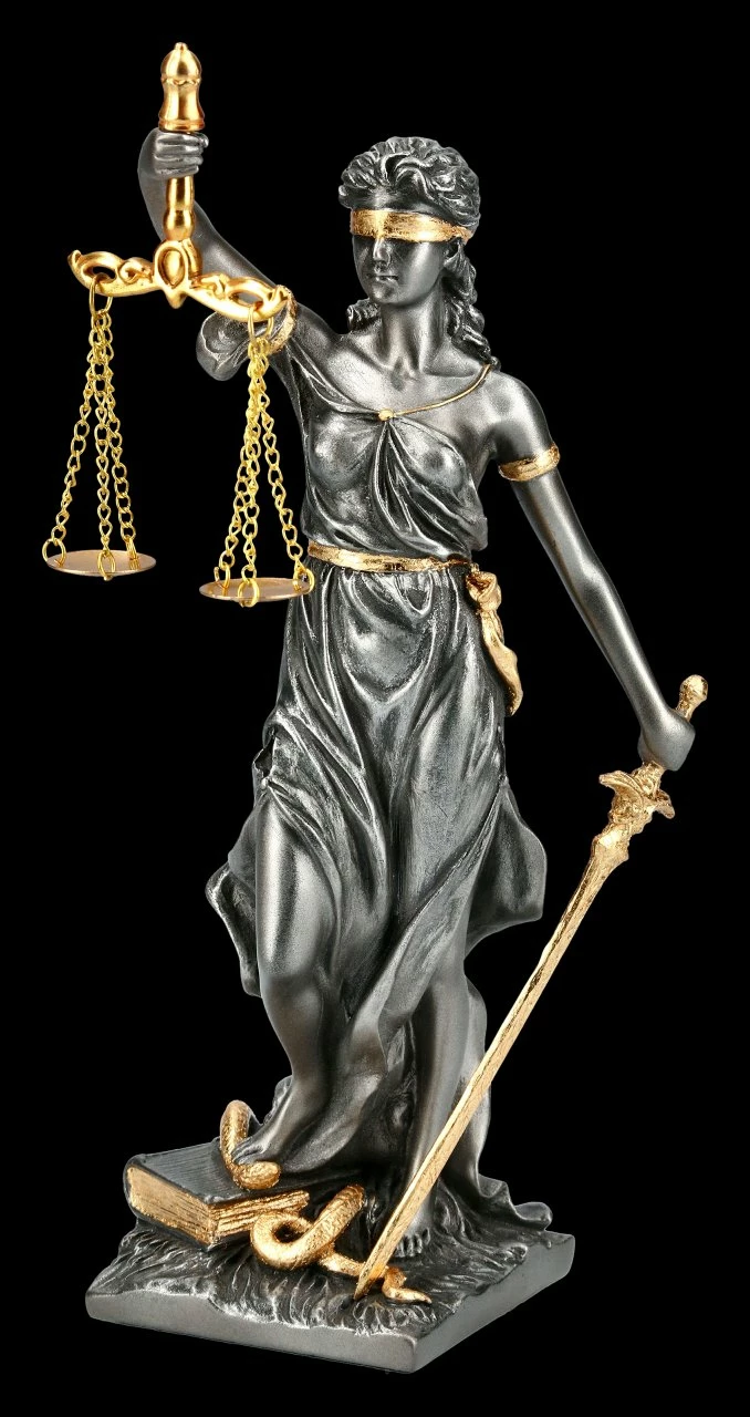 Justitia ist die römische Göttin der Gerechtigkeit. Im Griechischen wird sie Dike genannt. Die Justitia wird mit Waage (Abwägen der Sachlage), dem Richtschwert (durchführen der Entscheidung) und der Augenbinde (Unvoreingenommenheit) dargestellt.