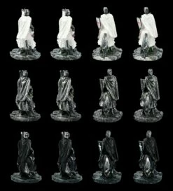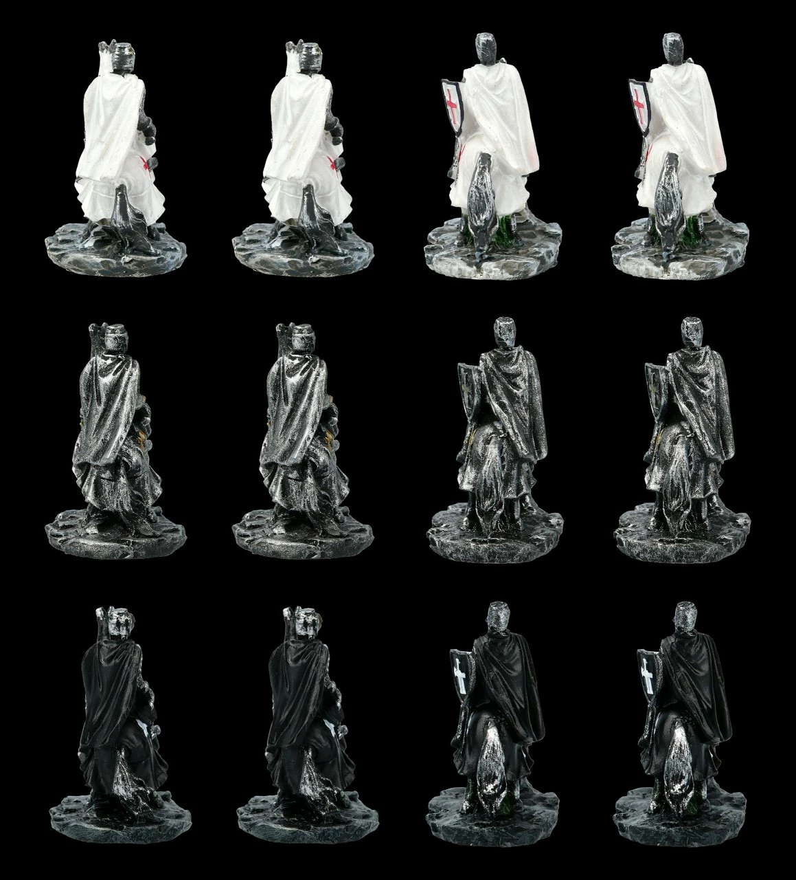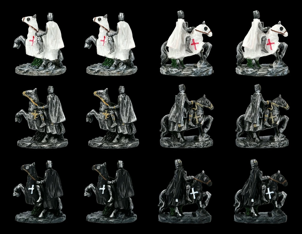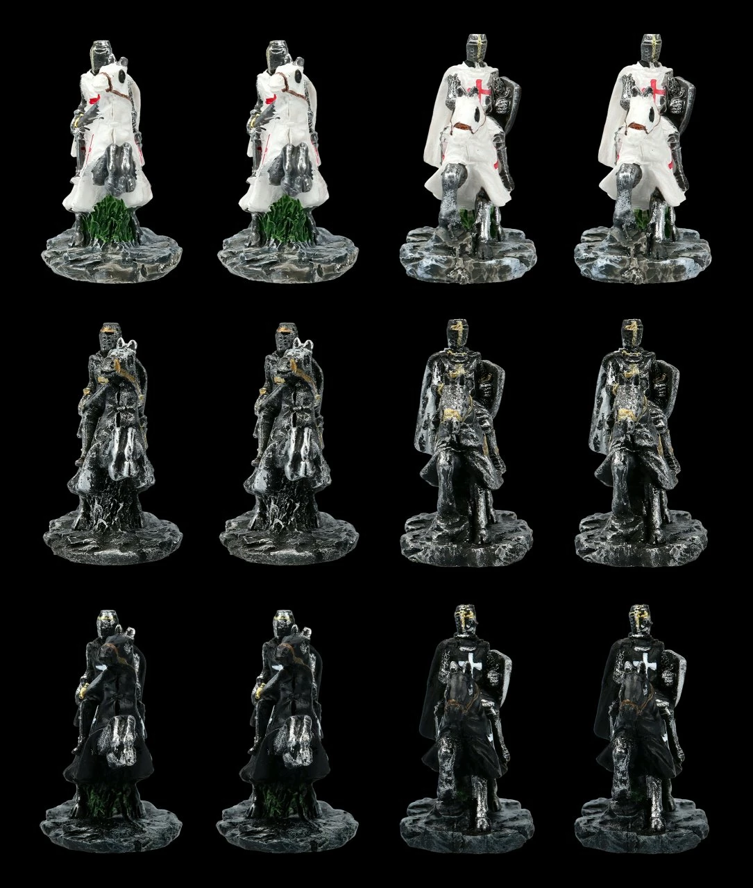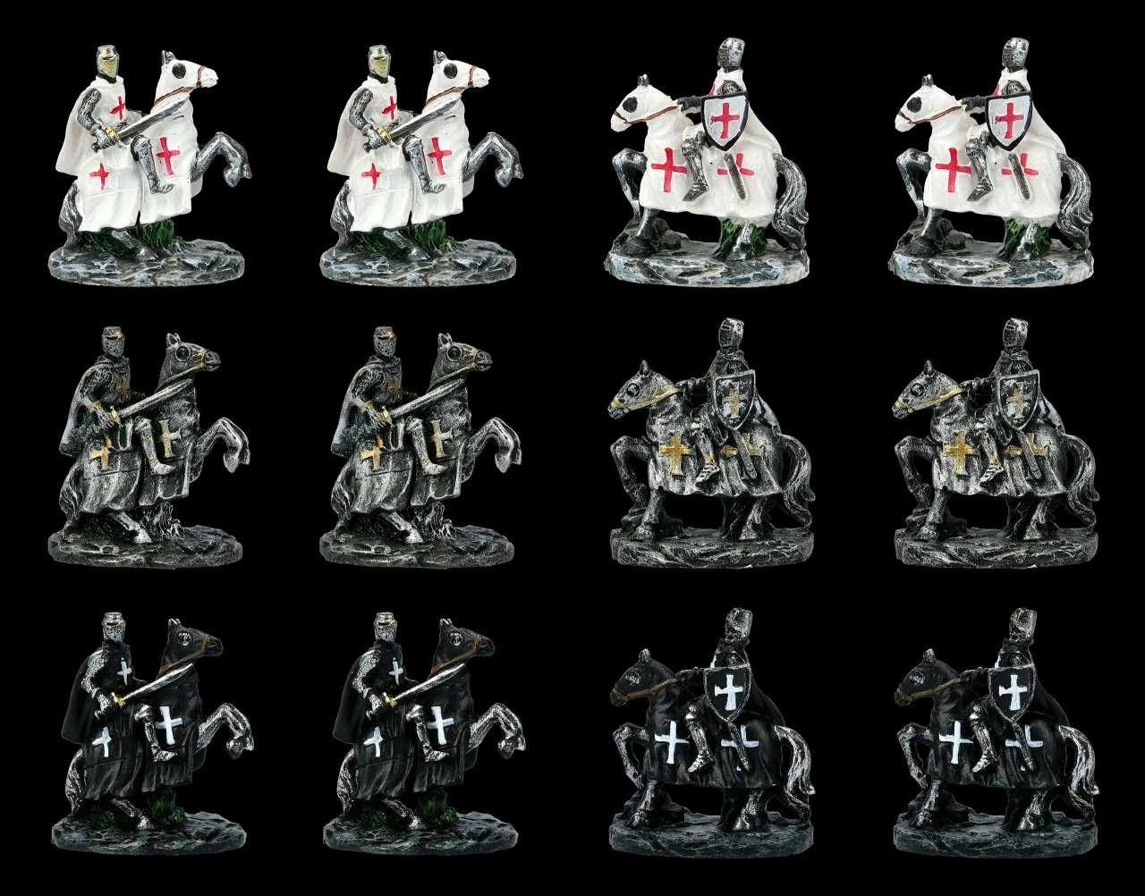 Das wunderbaren Ritterfiguren 12er Set beinhaltet vier weiße Kreuzritter auf Pferden mit rotem Kreuz, 4 in metallfarbener Rüstung mit goldenem Kreuz und 4 schwarze Kreuzritter mit weißen Kreuz. Die Kreuzritter auf den Pferden sind detailreich aus Kunststein (Polyresin) gefertigt und sorgsam handbemalt. Sie sind je 4 cm hoch, je 3,5 cm breit und je 2,5 cm tief und für Sammler von Ritterfiguren das perfekte Geschenk.