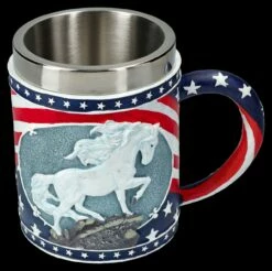 Wilde Pferdeherden zogen einst durch die Staaten und wurden in zahlreichen Western verewigt. Besonders die stolzen weißen Hengste haben es auch Künstlern angetan. Die Flagge der USA – auch Stars and Stripes genannt – und in der Mitte ein stolzer wilder weißer Hengst auf einem Felsen zieren diesen farbenprächtigen Krug. ‚Unconquered‘, also ‚unbesiegt‘ ist der weiße Hengst auf dem fantasievollen Krug aus der Serie ‚The Trail of Painted Ponies‘, einem der erfolgreichsten Kunstprojekte in den USA, bei dem sich zahlreiche Künstler mit ihren Pferdemotiven verewigen. Der wunderbare Krug wurde detailreich aus handbemaltem Kunststein (Polyresin) gefertigt und ist 13 cm hoch, 15 cm breit (ohne Henkel sind es 10 cm) und 10,5 cm tief. Er ist nicht nur dekorativ, sondern auch ein fantastisches Geschenk für alle Sammler und auch für alle, die von den wilden, freien und unbesiegbaren Pferden begeistert sind. Zur leichteren Reinigung hat der Krug einen herausnehmbaren Einsatz aus Edelstahl mit einem Fassungsvermögen von ca. 500 ml.