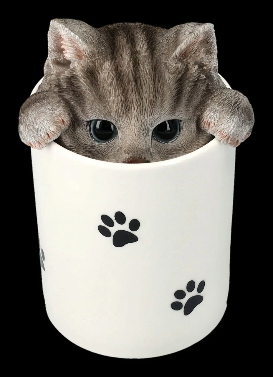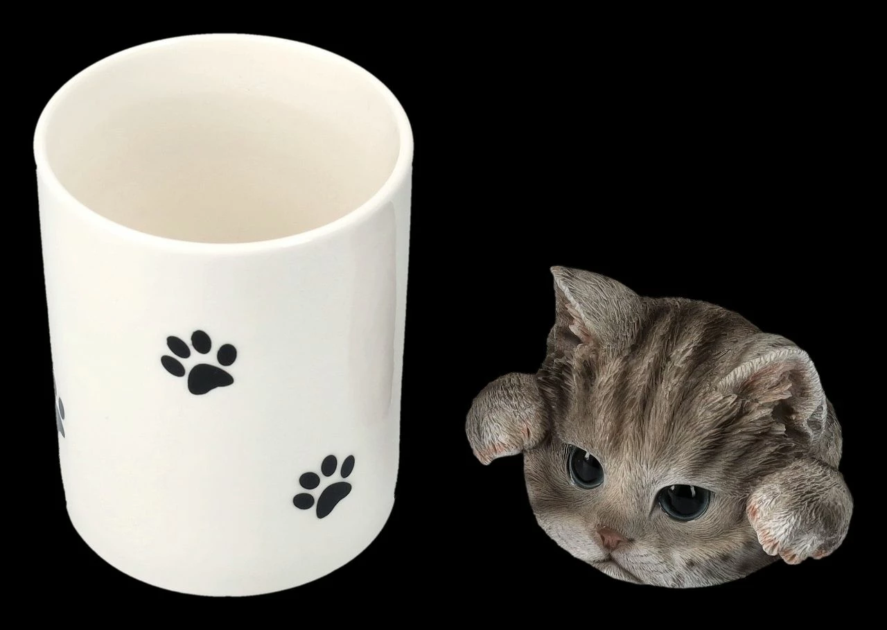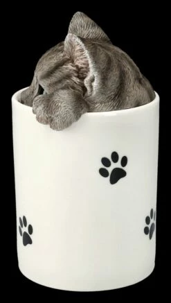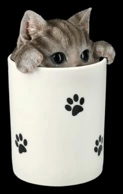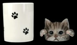 Ertappt – mit großen Augen scheint eine putzige kleine graue Katze aus der Leckerli-Dose klettern zu wollen. Dass es sich bei der wunderbar realistischen Katze aus liebevoll handbemaltem Kunststein (Polyresin) um den Deckel der Leckerli-Dose handelt, ist nicht auf den ersten Blick zu sehen. Die von HotAnt gewohnt hochwertig gefertigte, 15 cm hohe, 10 cm breite und 8,5 cm tiefe Leckerli-Dose aus Keramik mit dem Kätzchen-Deckel ist nicht nur praktisch, sondern auch einfach süß anzusehen. Innen hat die Dose mit H 10 cm x B 8 cm x T 8 cm ausreichend Platz für viele Leckerlis. Ein tolles Geschenk für alle Katzen-Freunde.