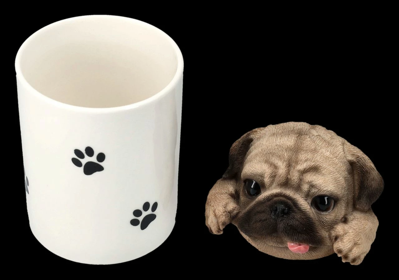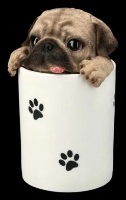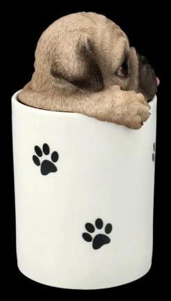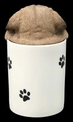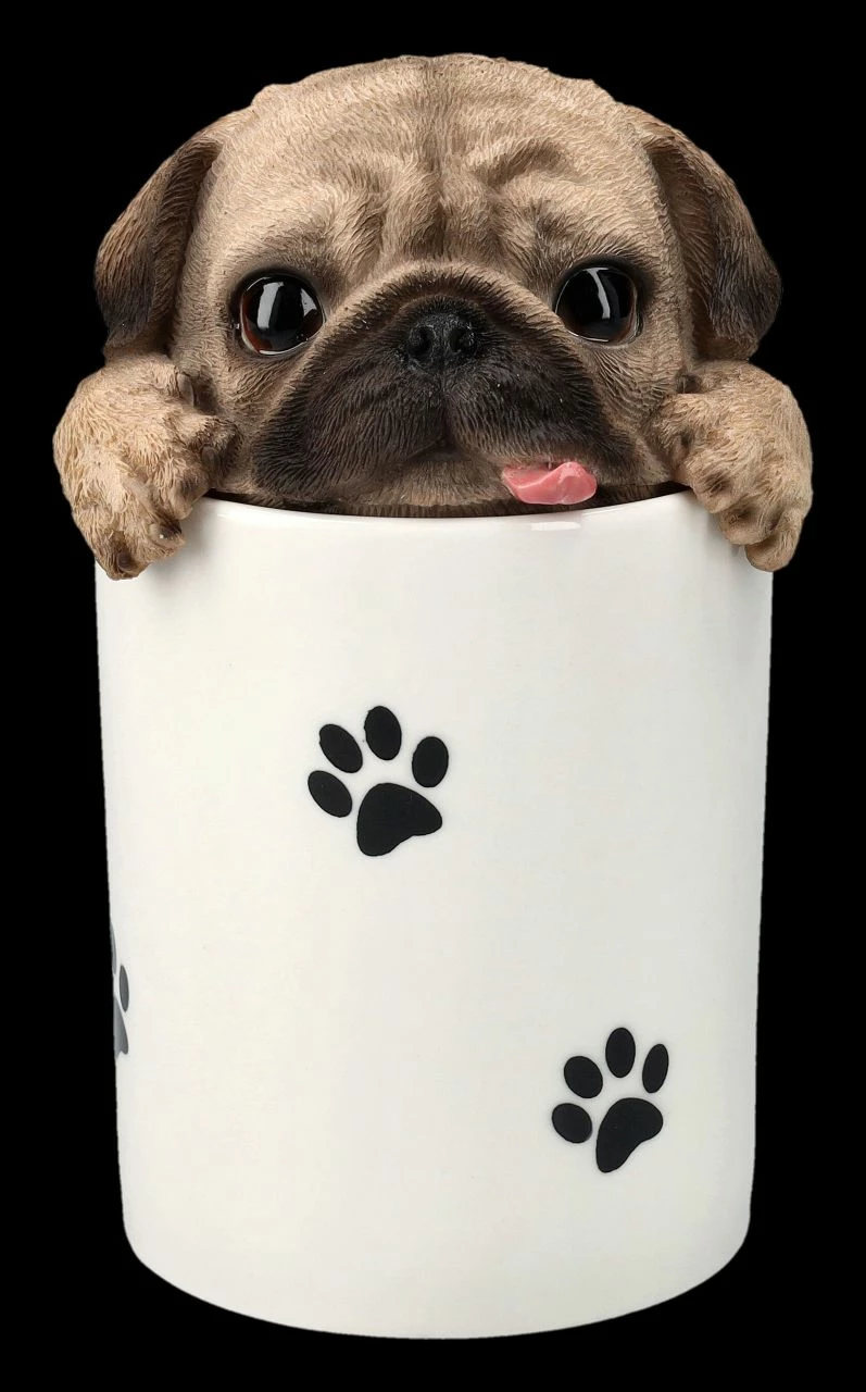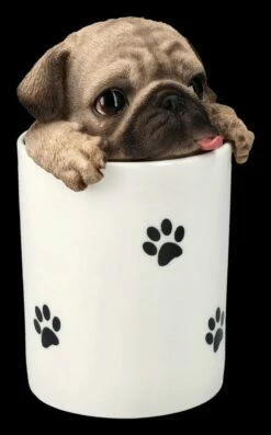 Na, das scheint dem kleinen Mops aber geschmeckt zu haben, denn er schleckt sich genießerisch sein Mäulchen mit der Zunge. Der freche Mops, der gerade aus der Leckerli-Dose klettern möchte, hat sich seine Belohnung wohl schon selbst geholt. Dass es sich bei dem wunderbar realistischen Mops aus liebevoll handbemaltem Kunststein (Polyresin) lediglich um den Deckel der Leckerli-Dose handelt, ist nicht auf den ersten Blick zu sehen. Die von HotAnt gewohnt hochwertig gefertigte, 16 cm hohe, 10 cm breite und 8,5 cm tiefe Leckerli-Dose aus Keramik mit dem kleinen Mops ist nicht nur praktisch, sondern auch einfach süß anzusehen. Innen hat die Dose mit H 10 cm x B 8 cm x T 8 cm ausreichend Platz für viele Leckerlis. Ein tolles Geschenk für alle Mops und Hunde-Freunde und natürlich – am besten mit Inhalt – auch gleich für alle Hunde.
