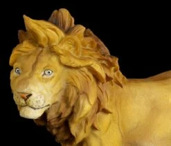 Die tolle Löwen Figur aus handbemaltem Kunststein ist für jeden Sammler von Wildkatzen ein tolles Geschenk. Der männliche Löwe hat eine beachtliche Mähne und schreitet erhobenen Hauptes sein Revier ab.