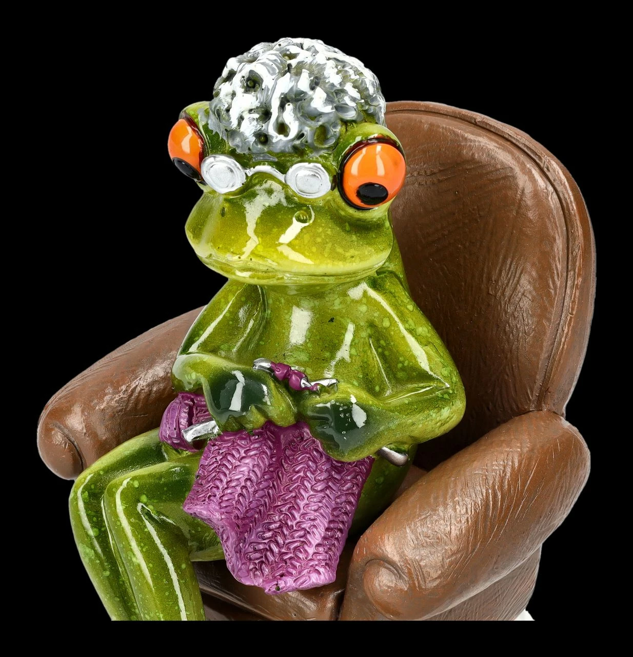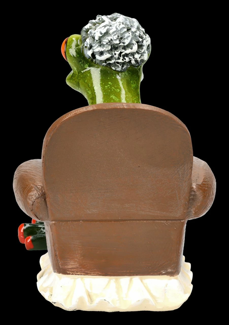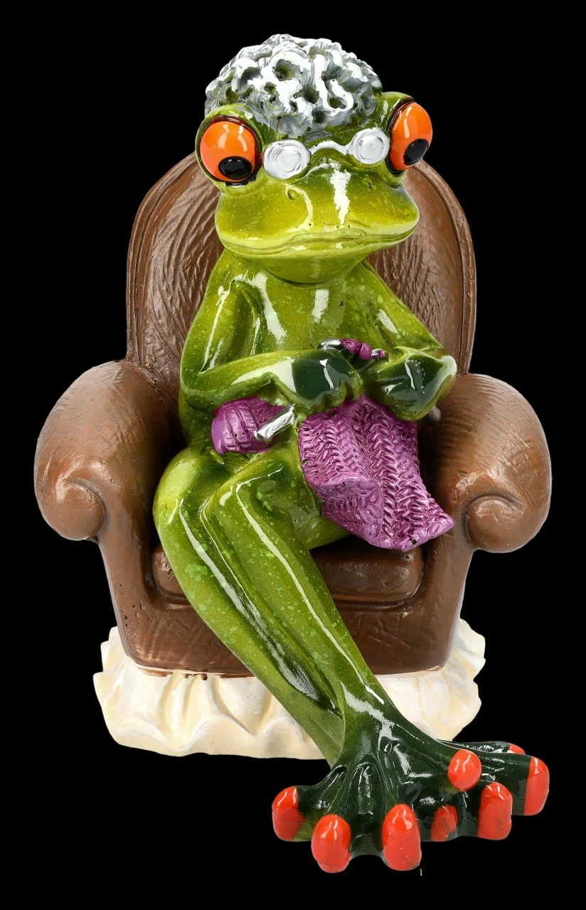 Mit der Brille auf der Nase sitzt die grauhaarige Oma mit dem Strickzeug in ihrem Lehnstuhl und scheint konzentriert die Maschen zu zählen. Warum sind die Anleitungen auch immer so kompliziert…. Die witzige Frosch-Oma beim Stricken ist 11 cm hoch, 8 cm breit und 11 cm tief und wurde detailreich aus liebevoll handbemaltem Kunststein (Polyresin) gefertigt. Die lustige knallig grüne Frosch-Oma beim Stricken ist aber auch ein witziges Geschenk für eine Oma mit Humor. Weitere witzige Frösche aus dieser Serie finden Sie in unserem Shop.