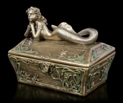 Die kleine Meerjungfrau hat tief auf dem Meeresgrund eine alte Truhe aus Holz gefunden. Die Metallbeschläge sind verwittert und die Truhe ist mit Seesternen und Algen überzogen. Ob es eine Schatztruhe ist? Das liegt ganz bei Ihnen! Die bronzierte und colorierte Schatulle aus Kunststein (Polyresin) eignet sich hervorragend für die Aufbewahrung kleiner Schmuckstücke.