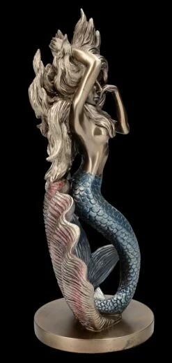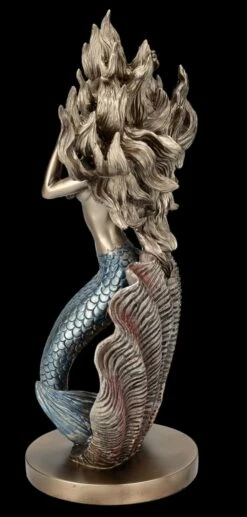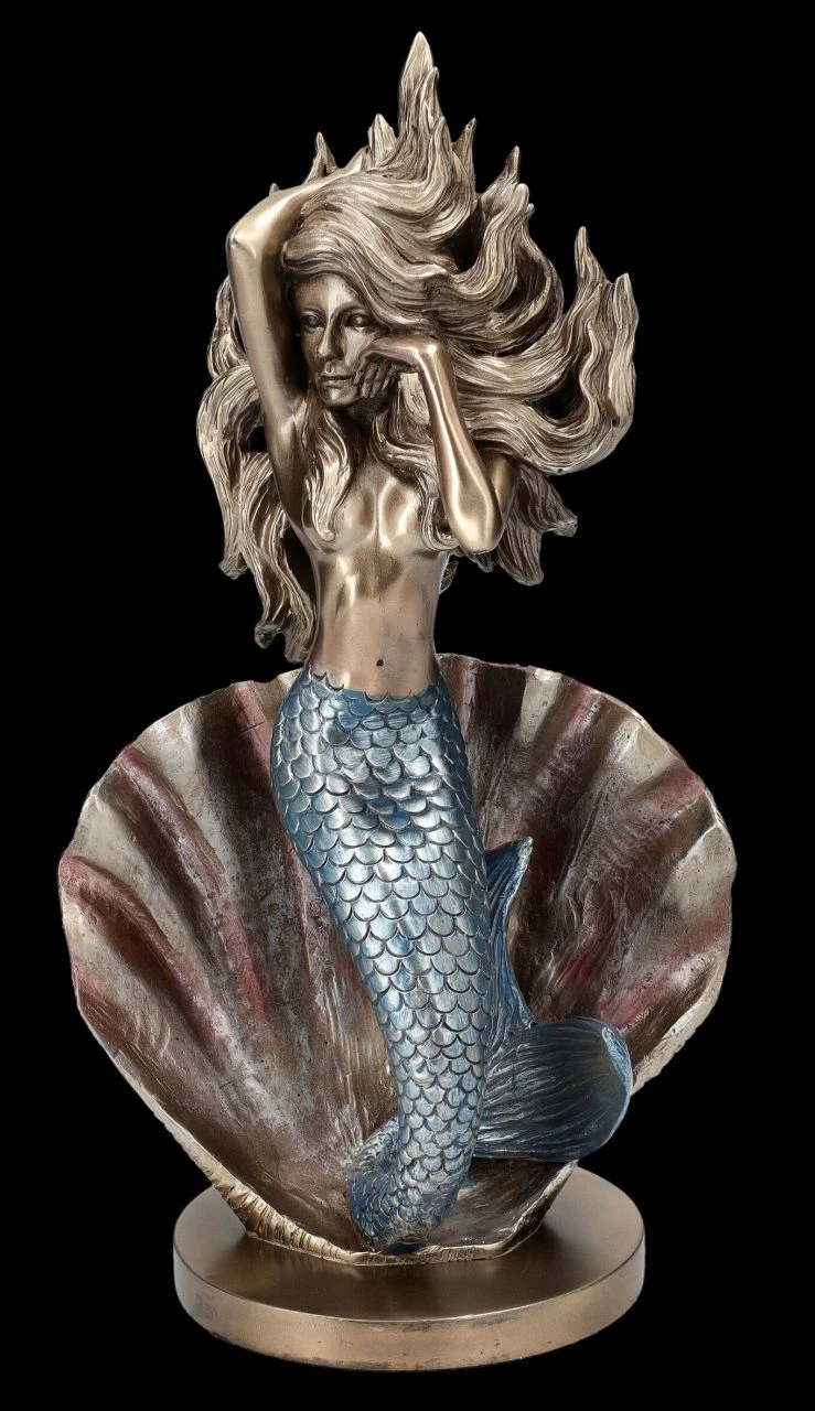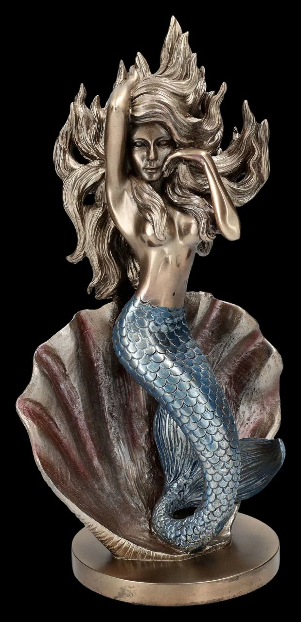 Dass man in Muscheln Perlen finden kann, ist sicherlich jedem bekannt. Aus dieser offenen Muschel entsteigt jedoch eine wunderschöne Meerjungfrau. Halb Fisch und halb wunderschöne junge Frau rĂ€kelt sich die schöne Meerjungfrau verfĂŒhrerisch vor der Muschel. Ihre langen Haare wehen in der Brise des Meeres. Das ist ein Motiv, das im Jugendstil von vielen KĂŒnstlern aufgenommen wurde. Auch diese von Hand bemalte schöne Skulptur aus hochwertigem Kunststein (Polyresin) wirkt beinahe wie ein Kunstobjekt aus der Jugendstil-Epoche. Die Skulptur der Meerjungfrau vor der Muschel ist 30,5 cm hoch, 16,5 cm breit und 11,5 cm tief. Sie ist ausgesprochen dekorativ und wird auf jedem Sideboard zum sofortigen Blickfang.