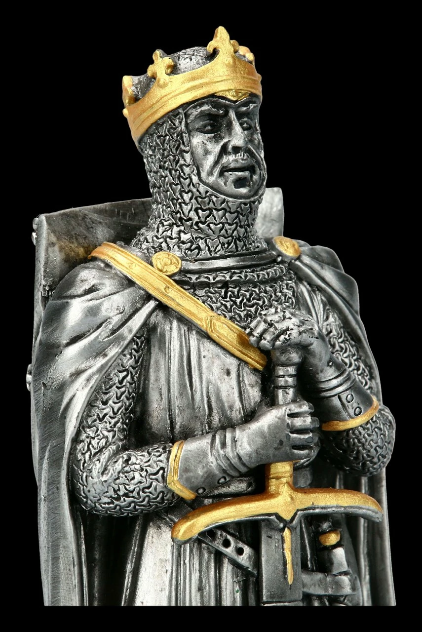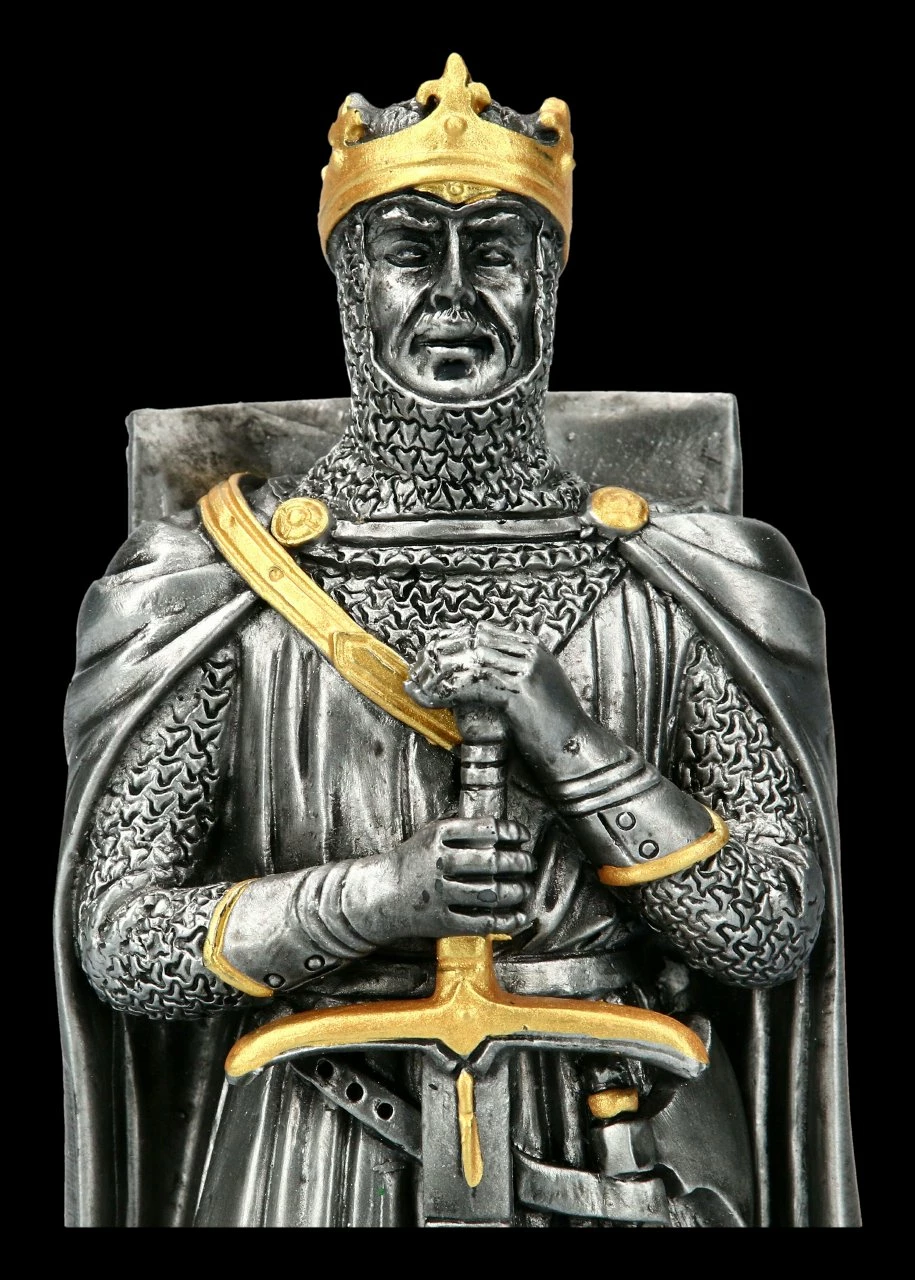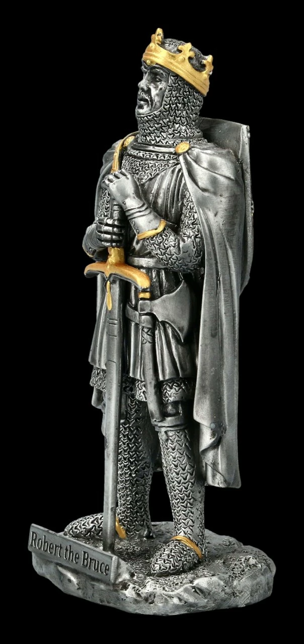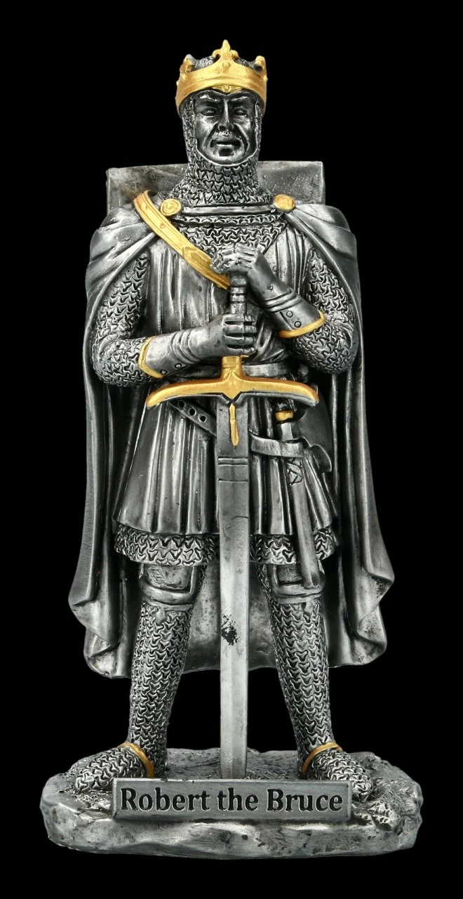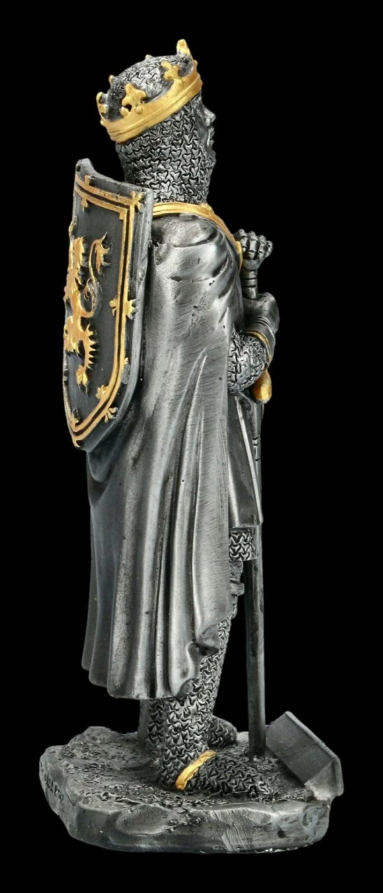 Robert the Bruce, geb. 1274, war von 1306 bis zu seinem Tod 1329 König von Schottland. Diese kleine Ritterfigur mit Schwert und Krone aus detailliert in Silbergrau und Gold handbemaltem Kunststein (Polyresin) von Nemesis Now ist 11,5 cm hoch, 5,5 cm breit und 4 cm tief. Die Figur steht auf einer wie Stein anmutenden Platte und hat vor sich ein Schild mit der Bezeichnung ‚Robert the Bruce‘. Für Sammler von Ritterfiguren ist diese kleine Ritter-Figur ein besonderes Geschenk und wird inklusive Geschenkbox verschickt.