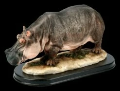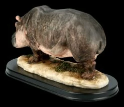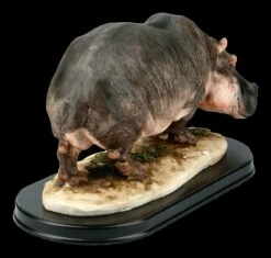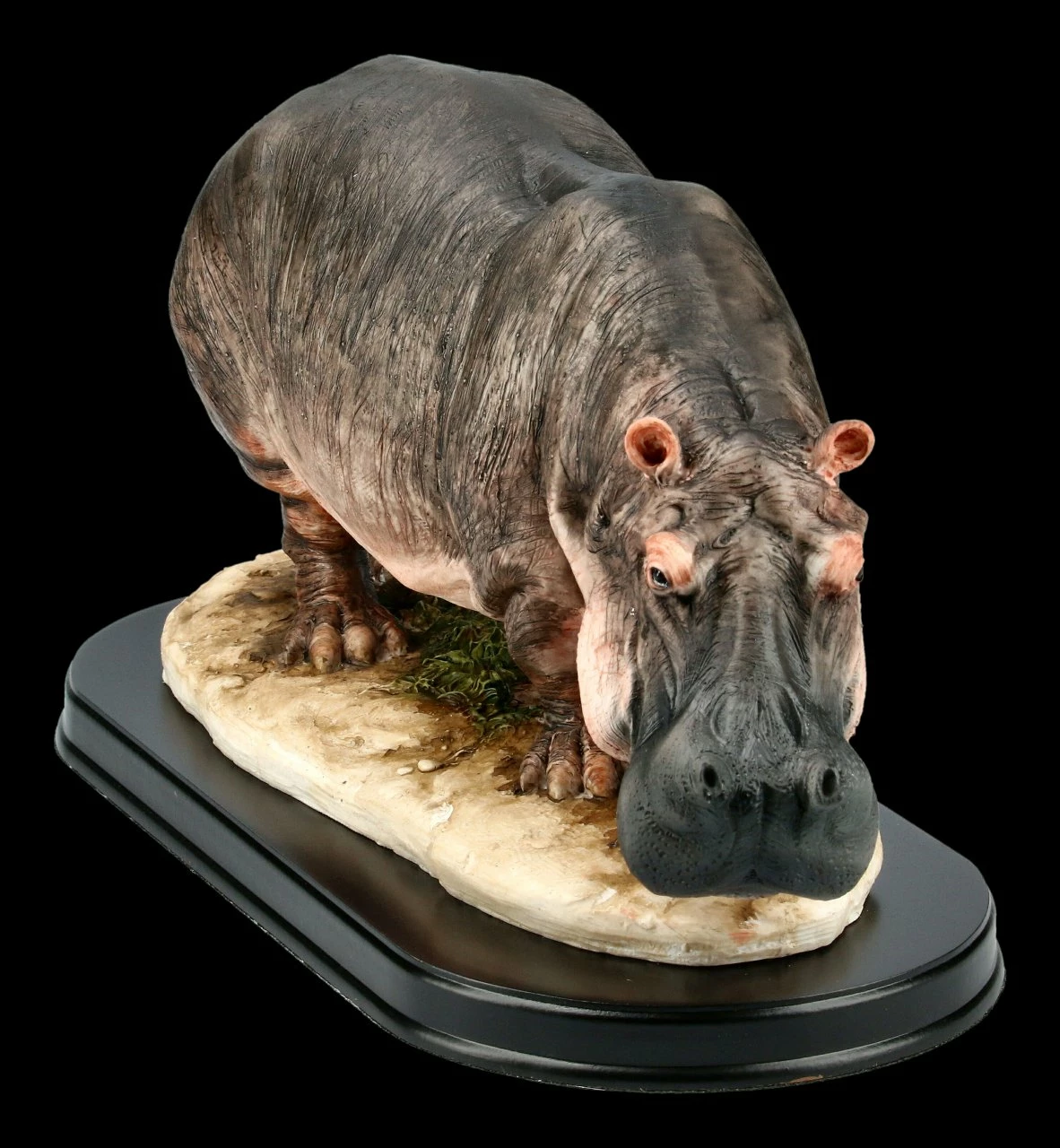 Eine außergewöhnliche Deko, die mit Sicherheit sofort alle Blicke auf sich ziehen wird, ist diese detailreich aus Kunststein (Polyresin) gefertigte und mit großer Sorgfalt handbemalte Nilpferd-Figur auf einem schwarzen Sockel. Das Nilpferd auf dem Sockel hat eine Höhe von 14,5 cm, eine Breite von 28,5 cm und eine Tiefe von 12,5 cm. Diese faszinierende Nilpferd-Figur passt als Ausstellungsstück in jedes Regal oder auf jeden Schreibtisch und ist auch ein außergewöhnliches Geschenk für Freunde, die die Natur lieben.