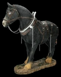 Wurde das Percheron Pferd früher im militärischen Bereich und vor allem in der Landwirtschaft eingesetzt, ist es heute sehr beliebt, Kutschen von einem Percheron Pferd ziehen.zu lassen. Percheron Pferde werden nach einem Landstrich im Norden Frankreichs benannt, der heute noch für seine Pferdezucht bekannt ist. Sie sind eine sehr auffällige und kraftvolle Kaltblutrasse, die schon optisch sehr beeindruckend ist. Das kommt bei dieser wunderbar detailreichen Pferde-Skulptur aus handbemaltem Kunststein (Polyresin) auch hervorragend zur Geltung. Die Pferde-Figur mit dem Percheron Kaltblut mit Geschirr ist 31 cm hoch, 34 cm breit und 12 cm tief und ein perfektes Geschenk für Pferdefreunde.