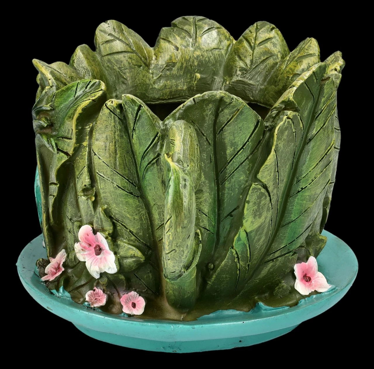 Die Elfe hat eine Kaffeetasse gefunden, mit grünen Blättern umwickelt und geschickt getarnt zu einem Häuschen umgebaut. In diesem niedlichen detailreichen Elfen-Haus aus liebevoll handbemaltem Kunststein (Polyresin) werden sich nicht nur Elfen, sondern auch Pflanzen sofort wohlfühlen. Es ist 12 cm hoch, 19 cm breit und 15 cm tief und kann ein Pflanzentöpfchen mit dem Durchmesser von ca. 9,5 cm aufnehmen. Natürlich kann das putzige Elfen-Haus auch direkt bepflanzt werden, da der Pflanzentopf ein Ablaufloch hat. Für jeden, der die Welt der Elfen liebt, ist dieser fantasievolle Pflanzentopf, der auf jeder Blumenbank zum Blickfang wird, ein absolut zauberhaftes Geschenk.