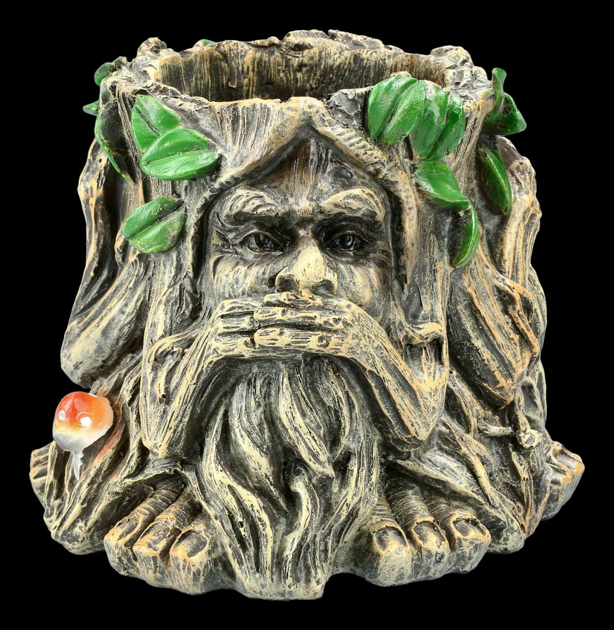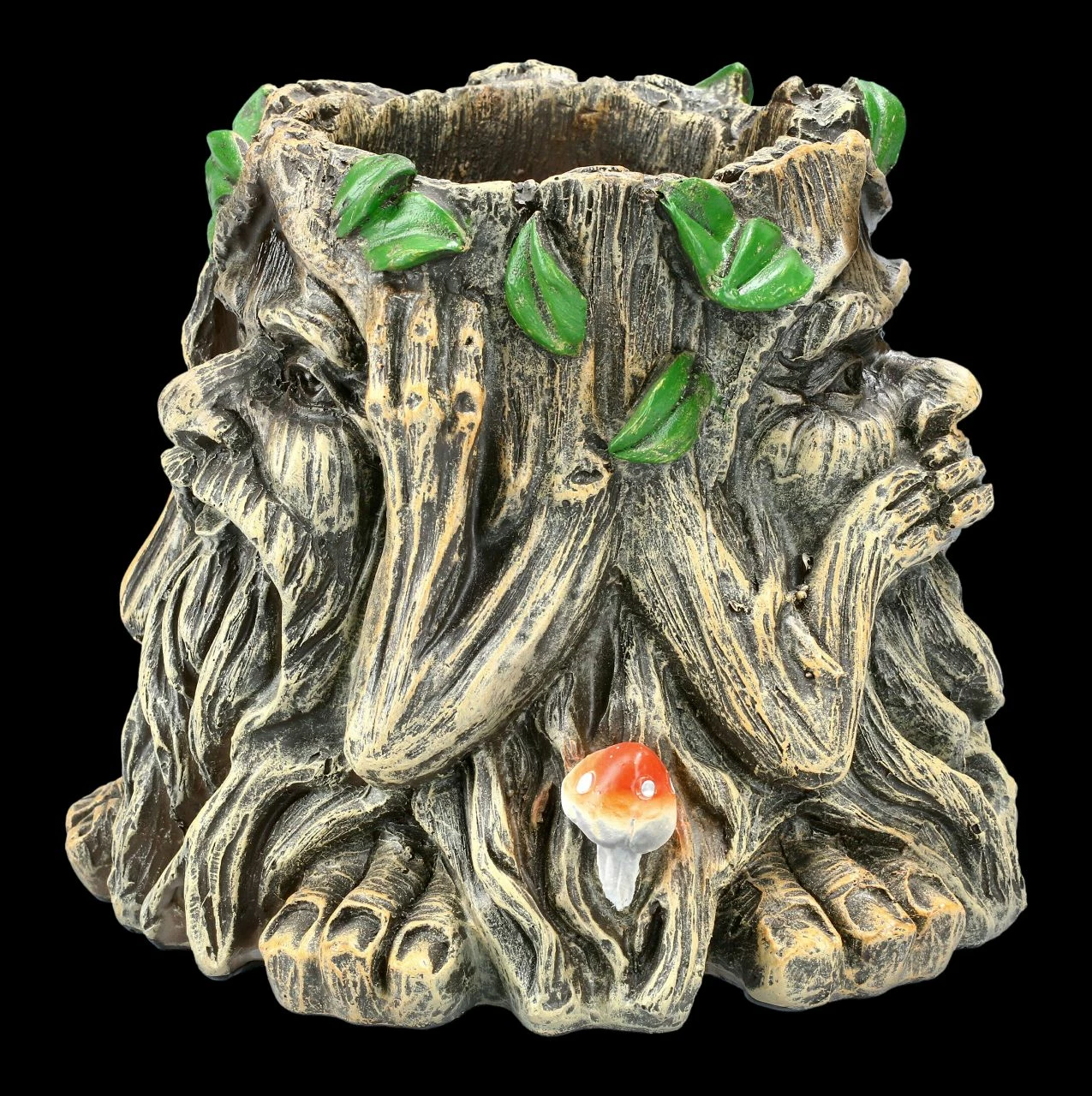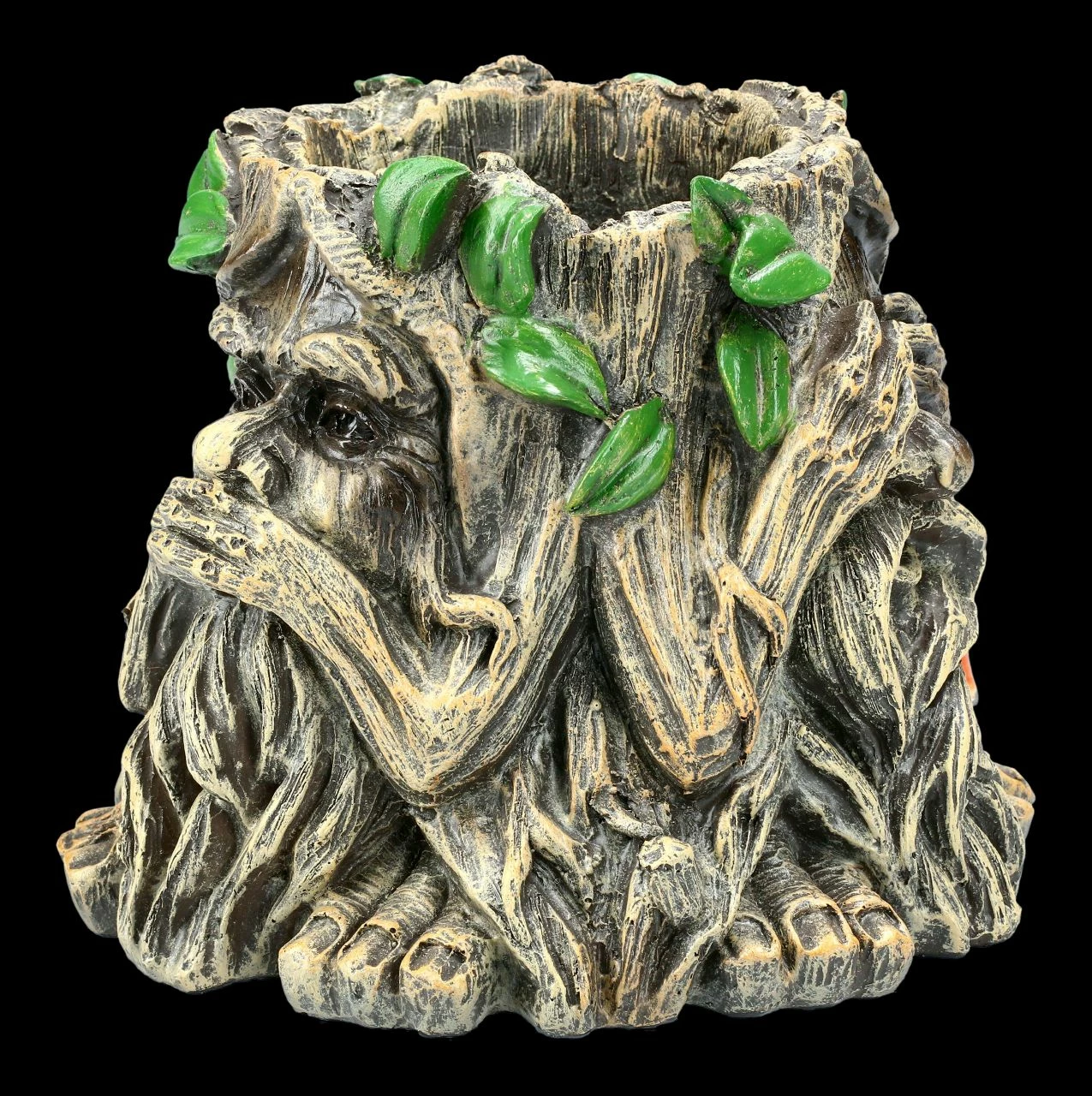 Der Greenman gilt als König der Wälder, er wahrt den Frieden und beschützt die Schwachen. Im Büro zeigt dieser Greenman mit seiner Gestik ‚Nichts Böses sehen, nichts Böses hören und nichts Böses sagen‘ die drei Merkmale einer gelungenen zwischenmenschlichen Interaktion, die besonders im Büro einen wichtigen Stellenwert haben. Mit einer Höhe von 14,7 cm, einer Breite von 17,0 cm und einer Tiefe 17,0 cm ist dieser Pflanztopf aus handbemaltem Kunststein (Polyresin) ein dekoratives und schützendes Element für Ihren Wohn- & Arbeitsbereich. Unsere Dekoration ist in der Lieferung nicht enthalten.