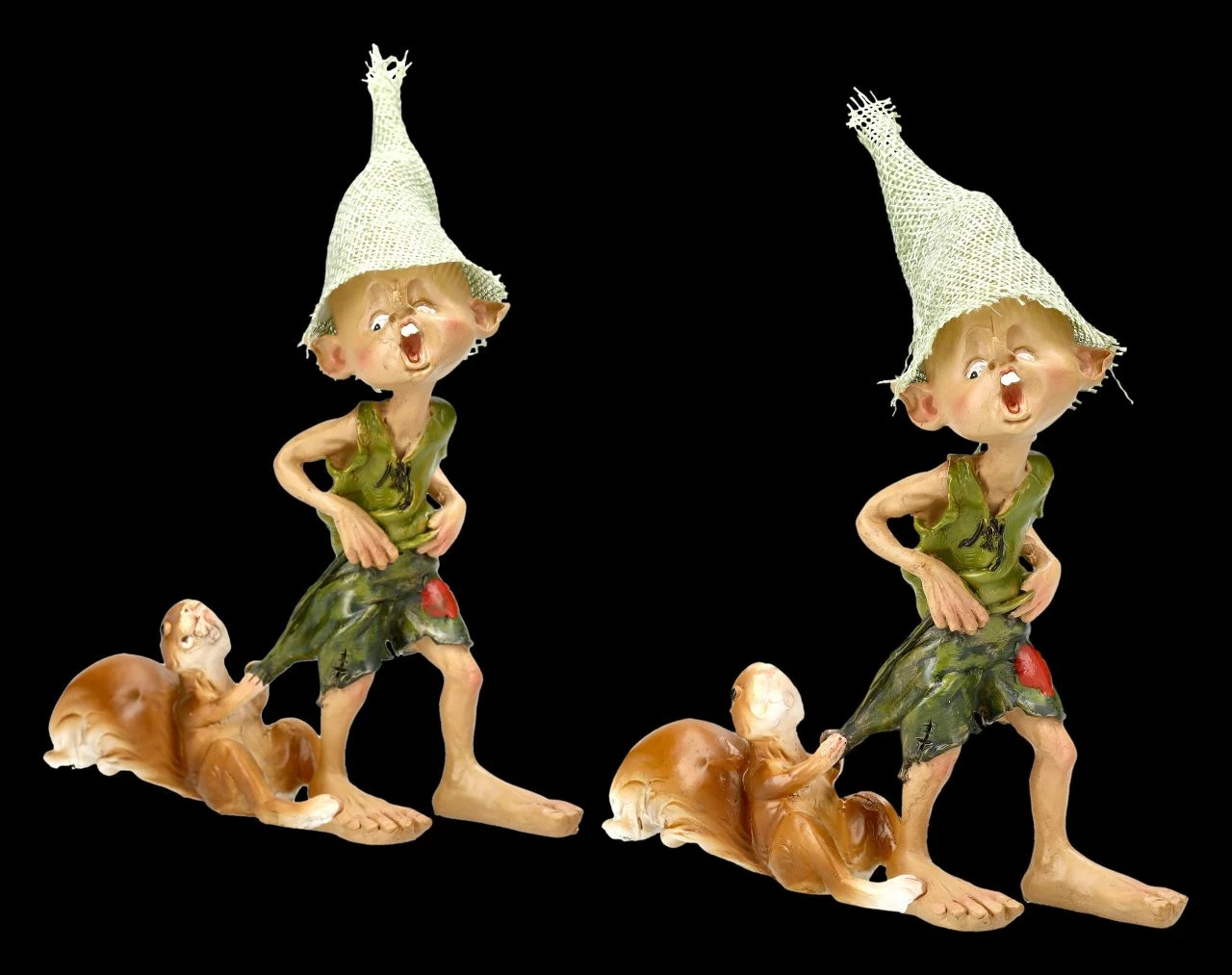 Hey, lass mich los! Der lustige kleine Kobold hält sein Gewand fest, an dem das freche Eichhörnchen heftig zieht. Für das Eichhörnchen kommt der Kobold wohl zu nahe an das Versteck der Nüsse und das geht doch gar nicht. Die lustige Kobold-Figur mit dem frechen Eichhörnchen kommt im 2er-Set und ist je 16 cm hoch, je 13 cm breit und je 4,5 cm tief. Die Pixie Kobold-Figuren wurden aus liebevoll handbemaltem Kunststein (Polyresin) gefertigt. Für jeden Pixie-Sammler sind die beiden Kobold-Figuren mit dem frechen Eichhörnchen ein wirklich fantastisches Geschenk. Sie können auch gleich mit Freunden geteilt werden. In unserem Shop gibt es übrigens für Sammler weitere niedliche Pixie-Figuren.