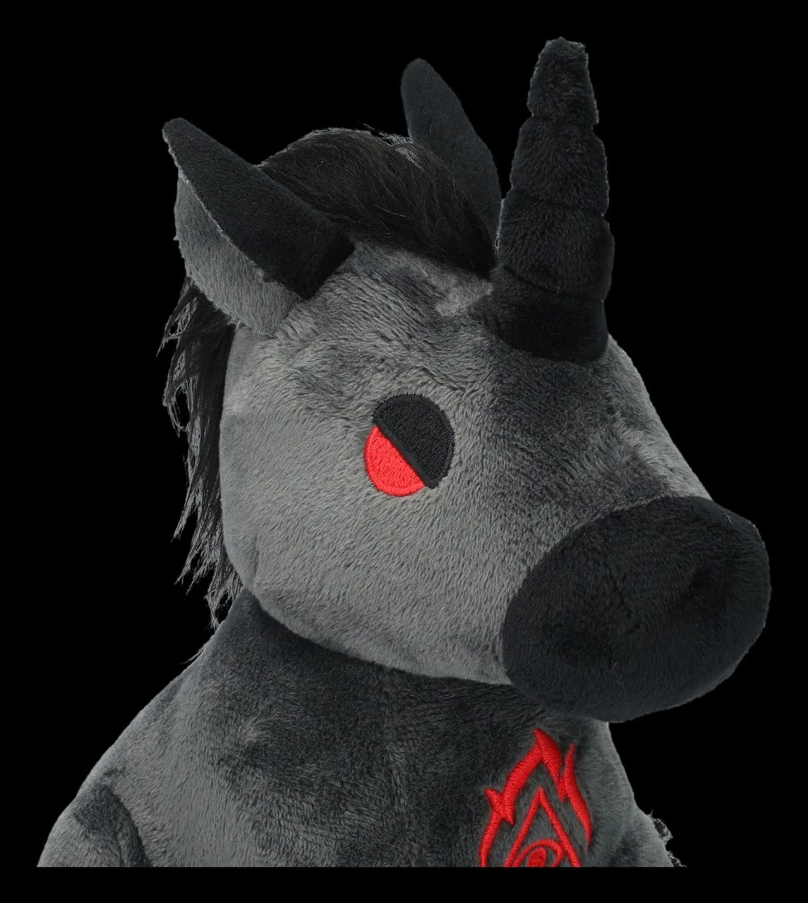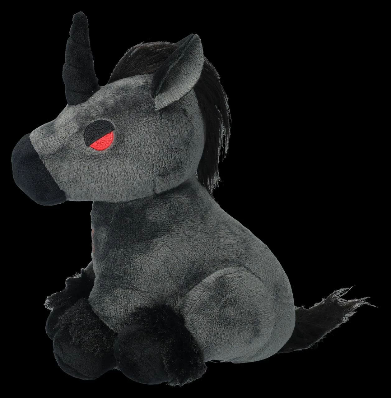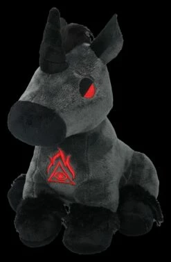 Das schwarze Einhorn zeigt wieder einmal, warum Einhörner nicht so leicht entdeckt werden. Wie man an dem roten Mal auf der Brust und den blutroten Augen sehen kann, gehört es zum geheimnisvollen Club der Gothic-Kuscheltiere. Das dritte Auge in dem Zeichen zeigt vermutlich, dass es den Blick für die Zwischenwelt hat. Das putzige Plüschtier aus kuschelig weichem 100 % Polyester ist 21 cm hoch, 14 cm breit und 17 cm tief. Für Babies und Kleinkinder ist das niedliche Einhorn nicht geeignet, aber wer sagt denn, dass nur Kinder Kuscheltiere haben dürfen…. Mit den anderen Kuscheltieren aus dieser Reihe bildet es gleich eine tolle Gemeinschaft und ist zum Sammeln das perfekte Geschenk.