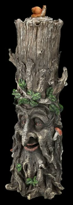 Als würde ein sanft lächelndes Gesicht aus einem uralten Baumstamm blicken, so wirkt dieser ungewöhnliche Räucherhalter. Auf dem spärlich mit grünen Blättern und Pilzen bewachsenen Stamm sitzt eine kleine Schnecke. Entfernt man die auf einem Korken sitzende Schnecke, entdeckt man die Öffnung für das Räucherstäbchen. Der Grüne Mann als Räucherhalter ist sehr detailreich aus handbemaltem Kunststein (Polyresin) gefertigt. Der Baum Ent ist 31,5 cm hoch, 11 cm breit und 10,5 cm tief. Dieser beeindruckende Räucherhalter mit dem Grünen Mann ist auch ein fantasievolles Geschenk. Die Lieferung erfolgt ohne Räucherstäbchen, die Sie jedoch in großer Auswahl in unserem Shop finden können.