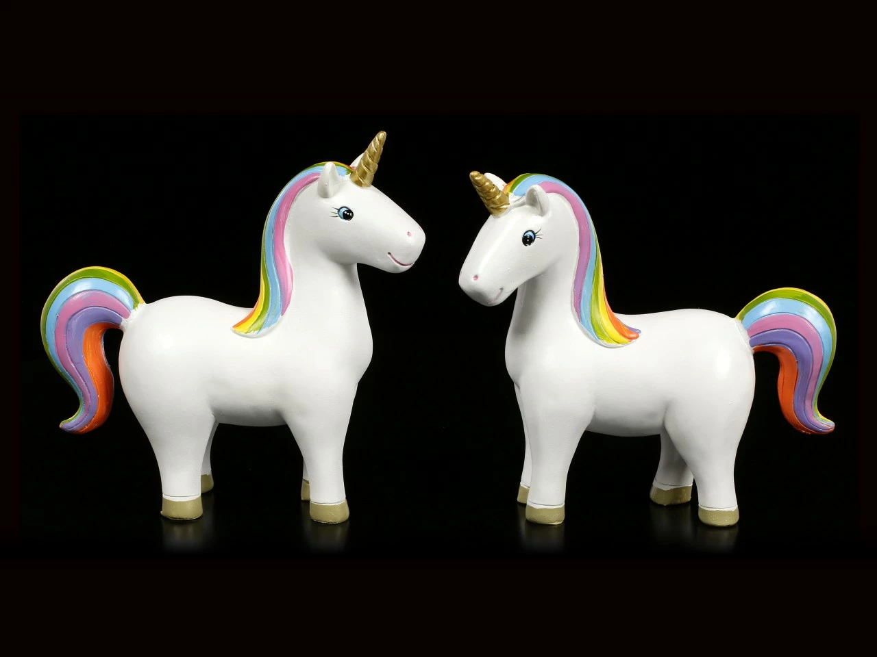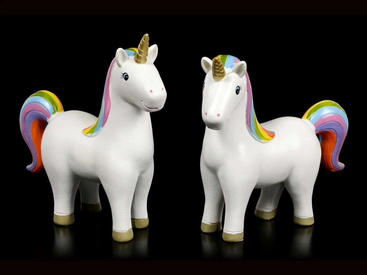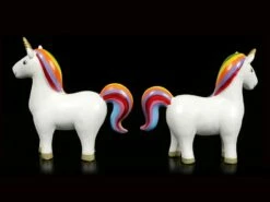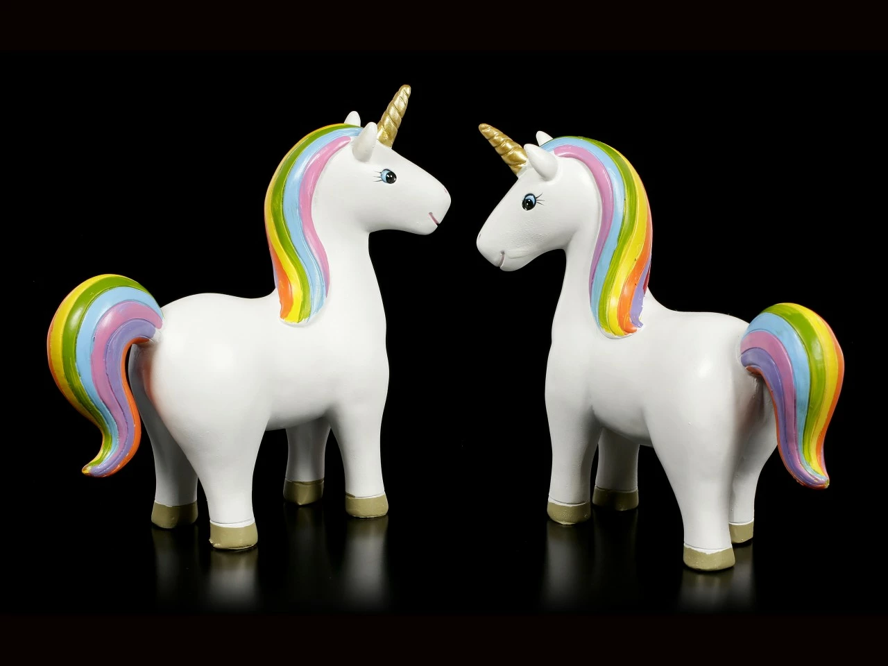 Sind die zwei Regenbogen Einhörner nicht einfach zu niedlich? Die bunte MĂ€hne und der bunte Schweif bringen Farbe in Ihre Wohnung. Perfekt fĂŒr Einhorn Fans.Â