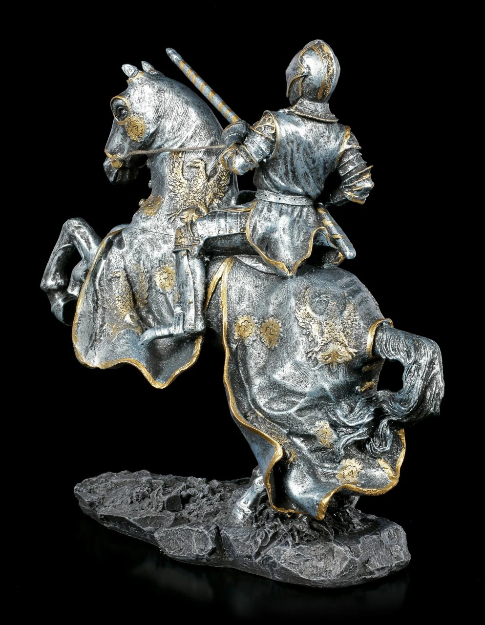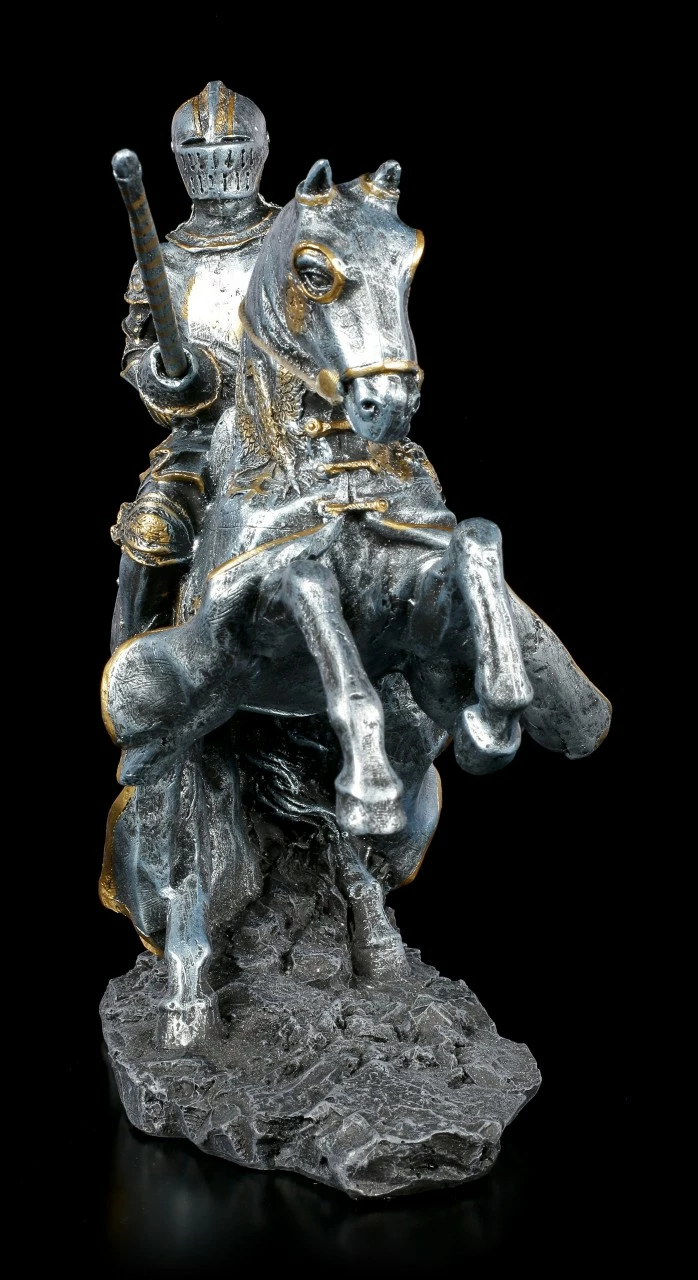 Der Ritter tritt mit seinem Schlachtroß beim großen Turnier der Könige an. Er möchte sich beim Lanzen Stechen beweisen und zeigen was er kann. Die umwerfende handbemalte Ritter Figur auf Pferd ist aus Kunststein (Polyresin) und sollte bei keinem Mittelalter Begeisterten fehlen.