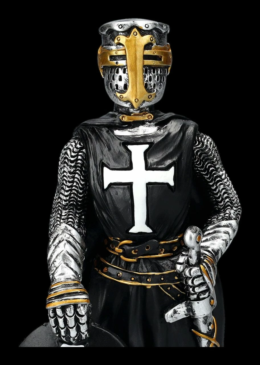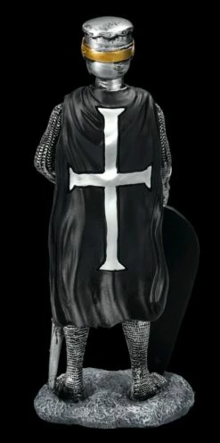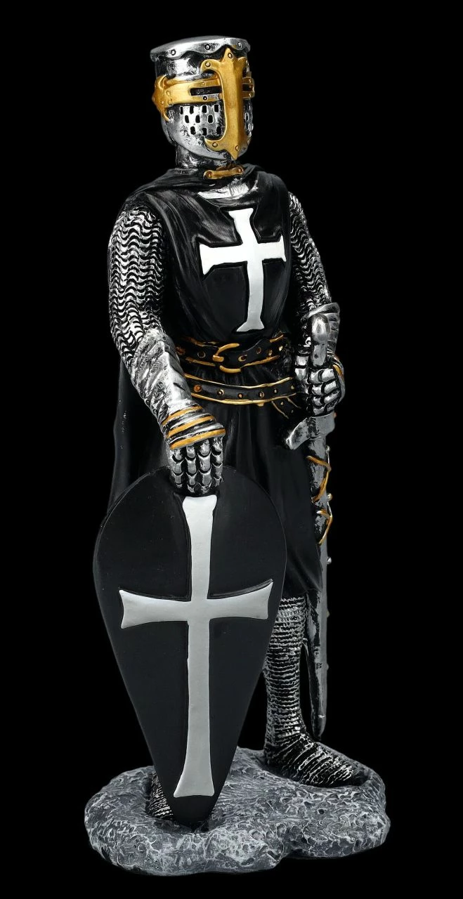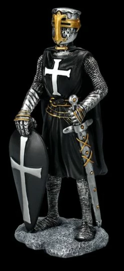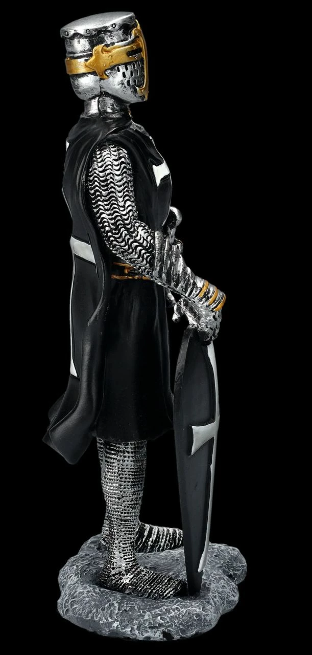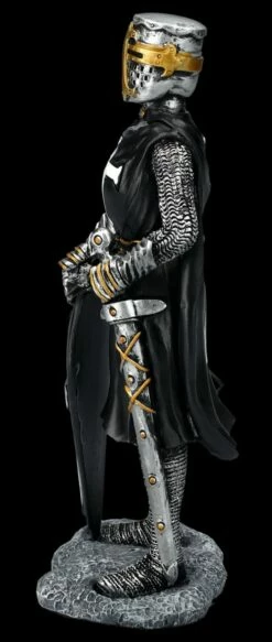 Die rechte Hand der detailreichen Ritter Figur ruht lässig auf seinem schwarzes Schild mit dem weißen Kreuz und mit der linken Hand hält er den Knauf seines Schwertes. Diese fantastische Figur eines Ritters des Deutschen Orden ist ein perfektes Geschenk für Ritter. Sie wurde sorgfältig aus Kunststein (Polyresin) gefertigt und von Hand bemalt. Der Ritter des Deutschen Orden in voller Rüstung,mit schwarzem Umhang und weißem Kreuz ist 21 cm hoch, 9 cm breit und 8 cm tief und eine fantastische Ergänzung jeder Ritter-Sammlung. Schließlich war das Ziel des im Dritten Kreuzzug gegründeten geistlichen Ritterordens unter anderem auch, den Kranken, Verwundeten und Bedürftigen zu helfen.