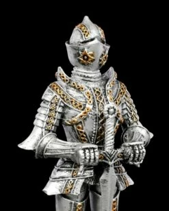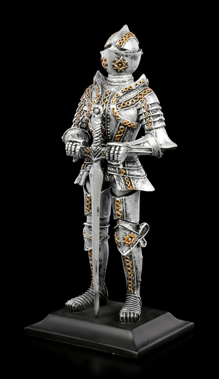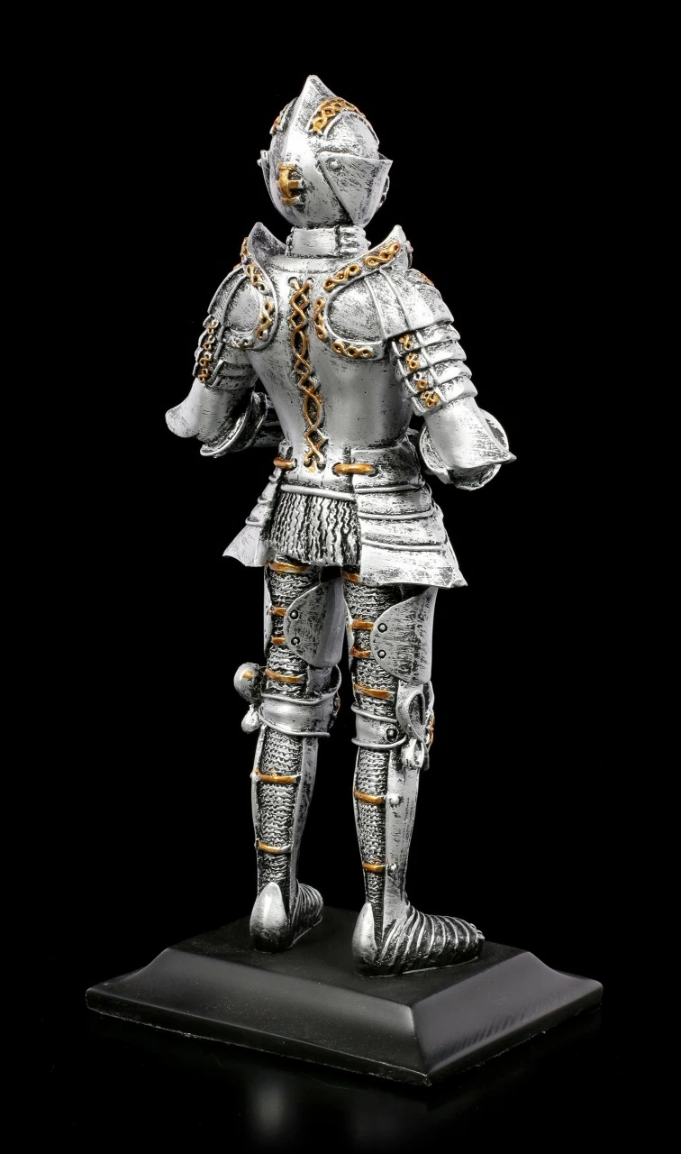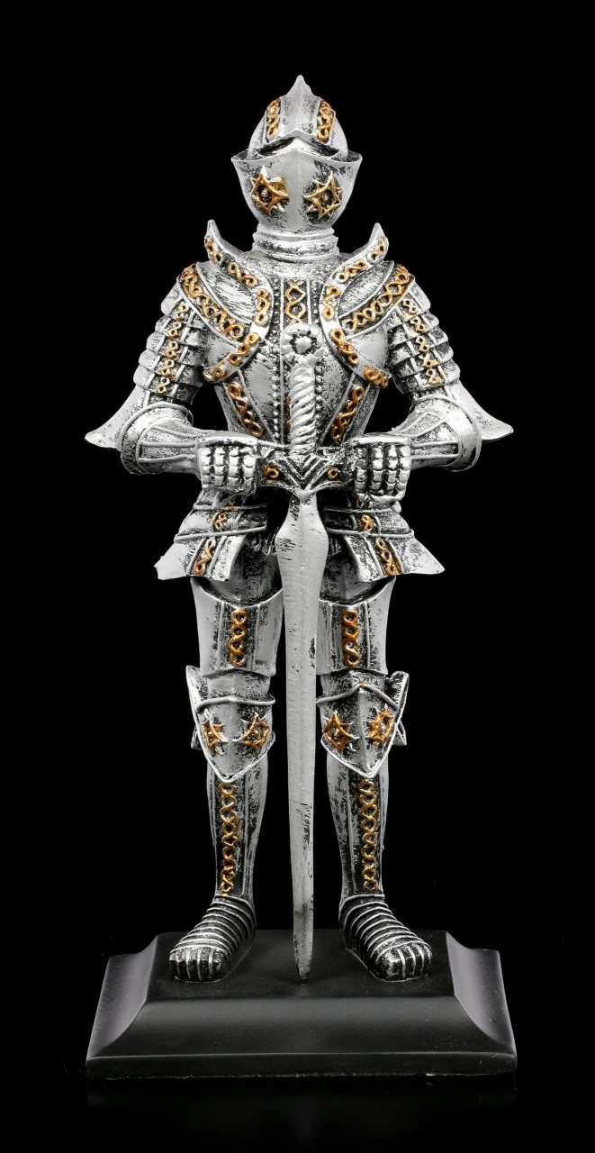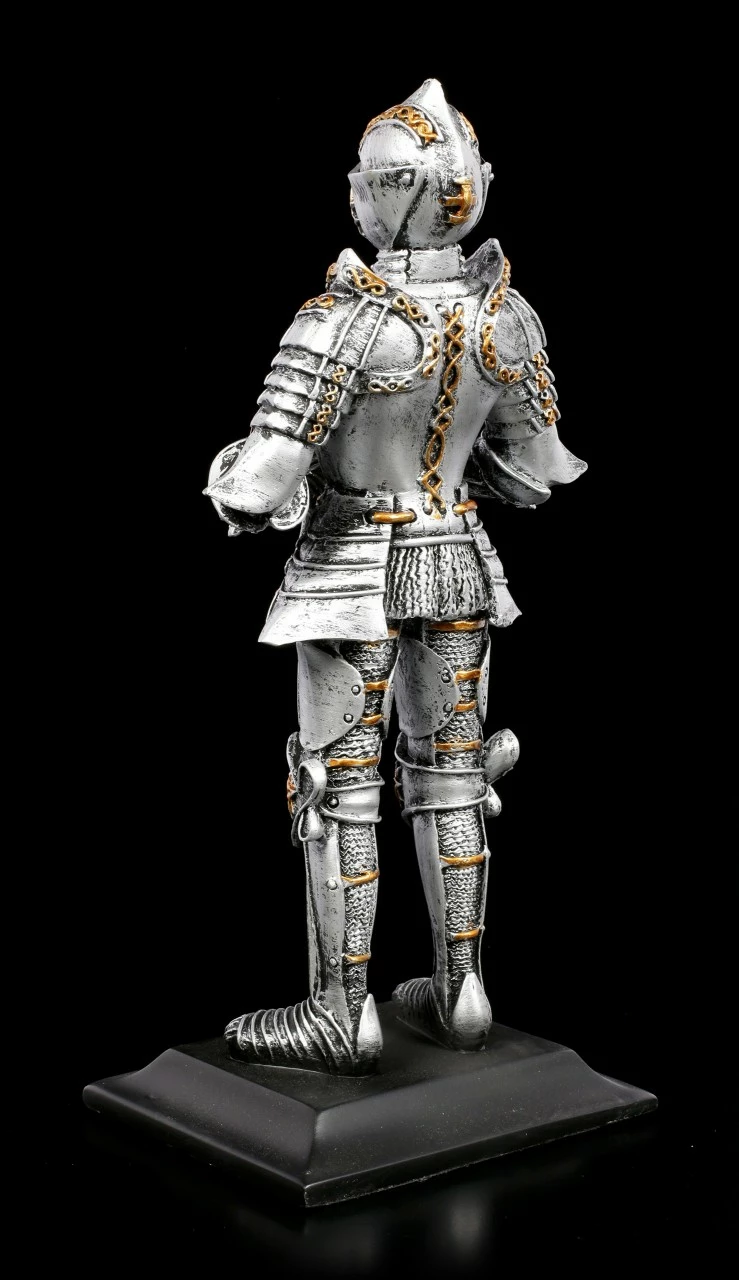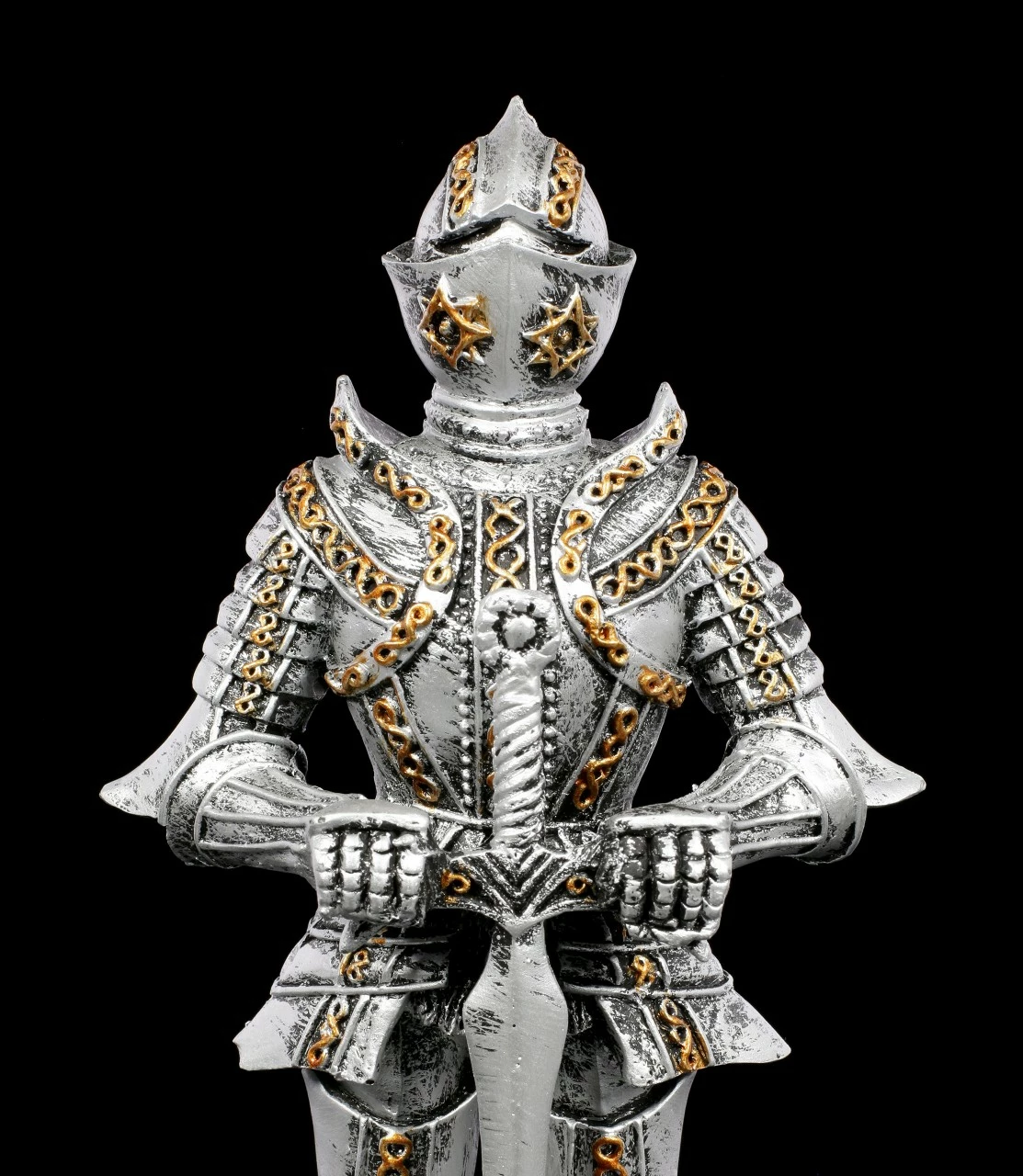 Die Ritter Rüstung aus Kunststein (Polyresin) wurde detailreich handbemalt und wird Sie begeistern. Die reich verzierte Ritter Rüstung auf schwarzem Sockel ist eine wunderbare Ergänzung zu jeder mittelalterlichen Sammlung.