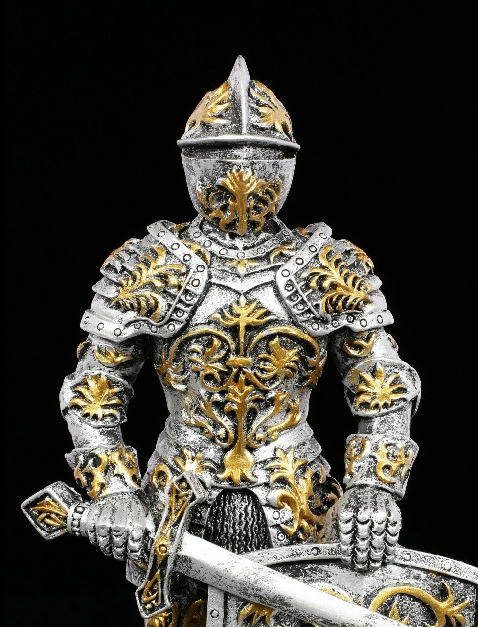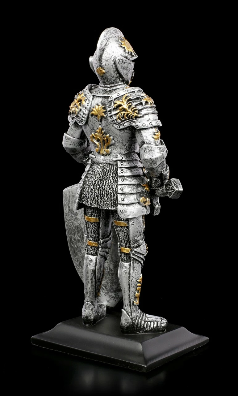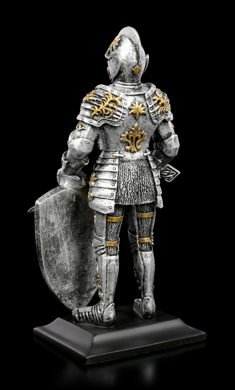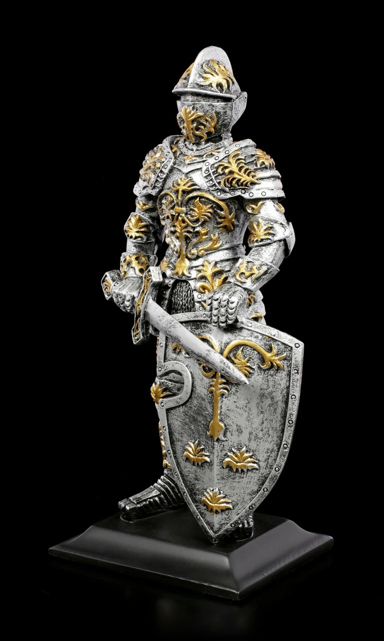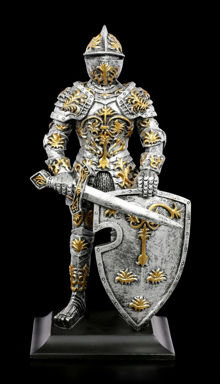 Die reich verzierte Ritter Rüstung auf schwarzem Sockel mit goldfarbenen Akzenten ist eine wunderbare Ergänzung zu jeder mittelalterlichen Sammlung. Das Schild des Ritters ist mit Ornamenten und der französischen Lilie versehen. Die handbemalte Ritter Rüstung ist aus Kunststein (Polyresin) und wird Sie begeistern.