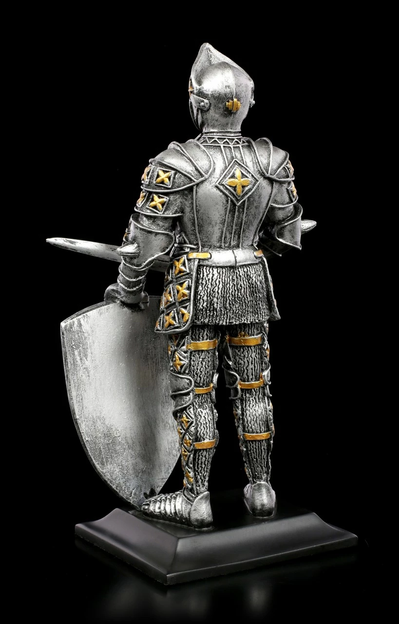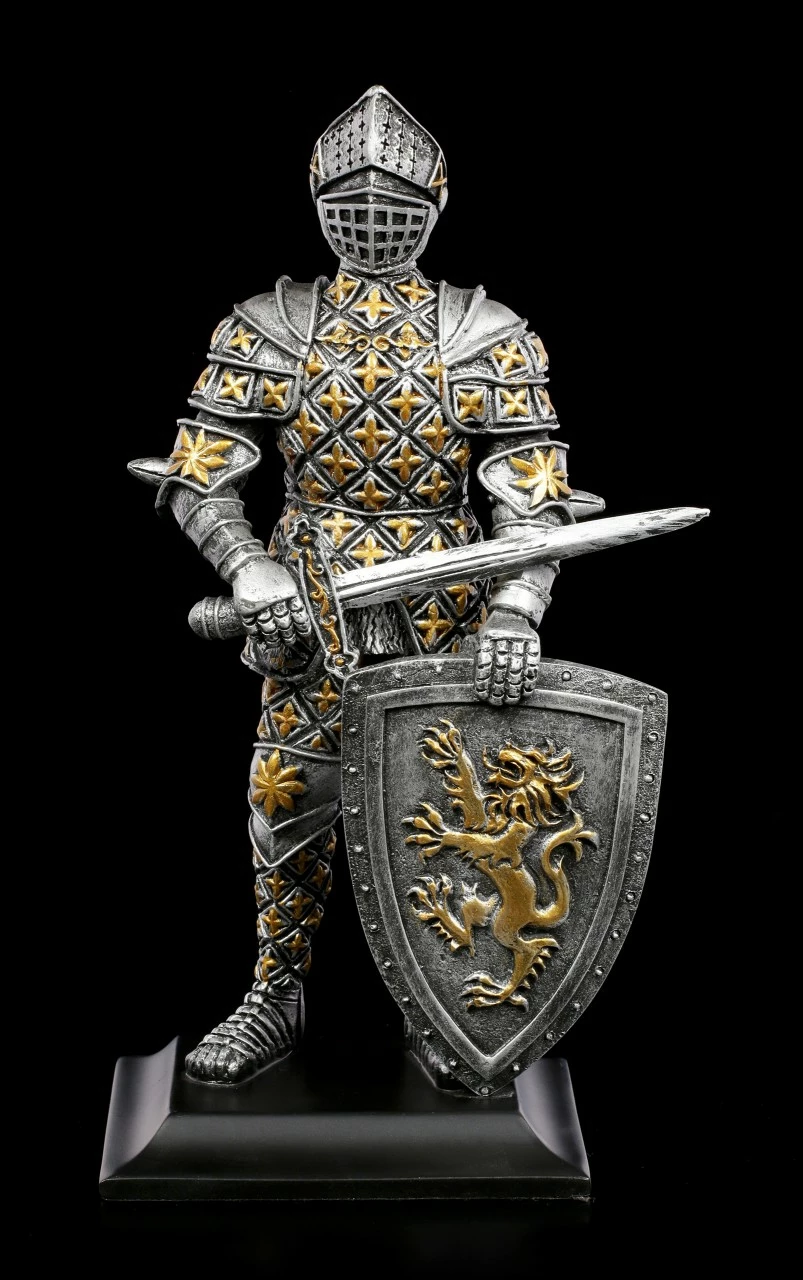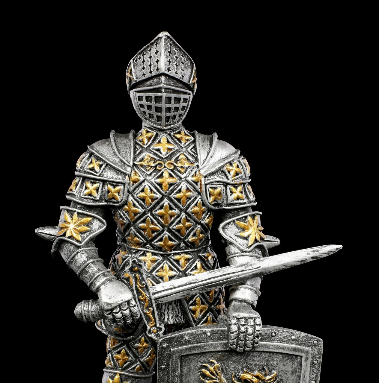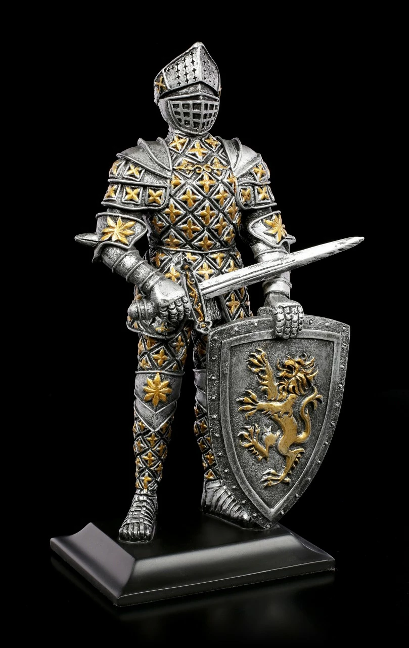 Die reich verzierte Ritter Rüstung auf schwarzem Sockel ist eine wunderbare Ergänzung zu jeder mittelalterlichen Sammlung. Das Schild des Ritters ist mit einem Löwenemblem versehen. Die handbemalte Ritter Rüstung ist aus Kunststein (Polyresin) und wird Sie begeistern.