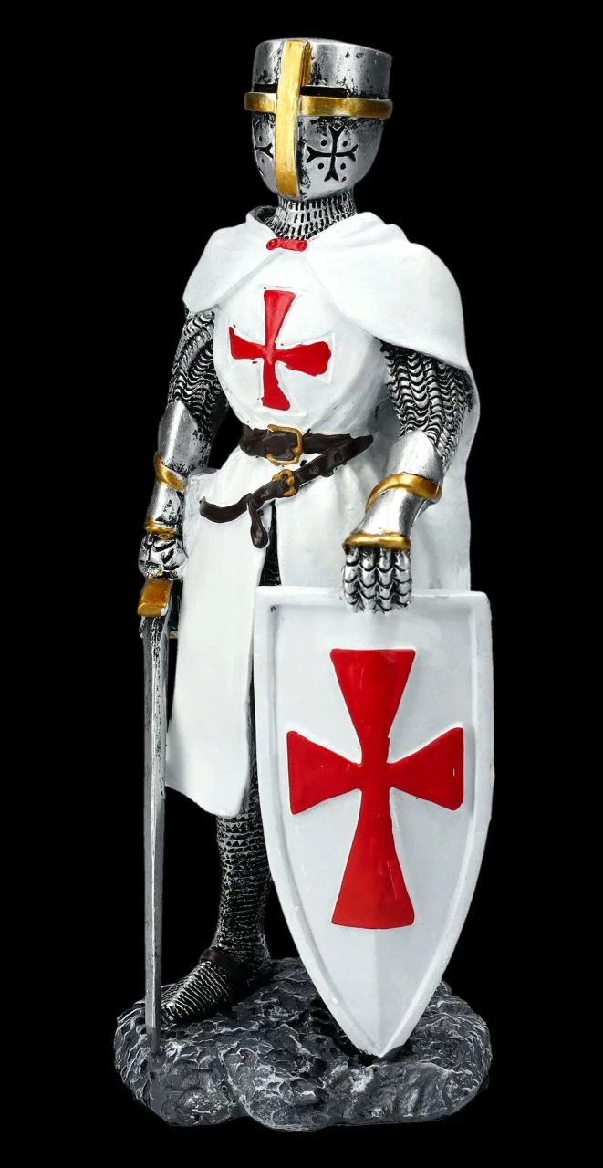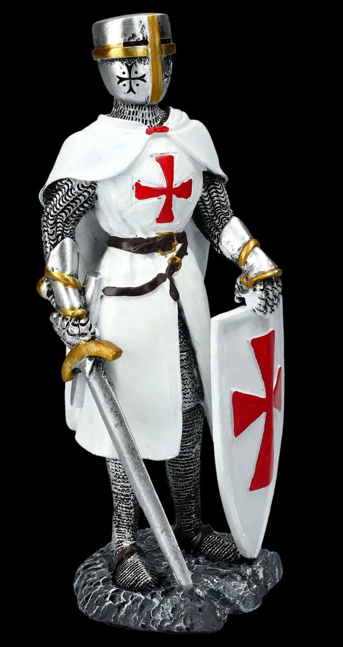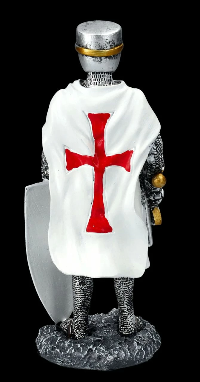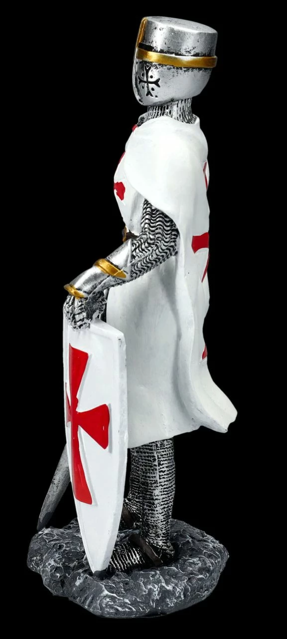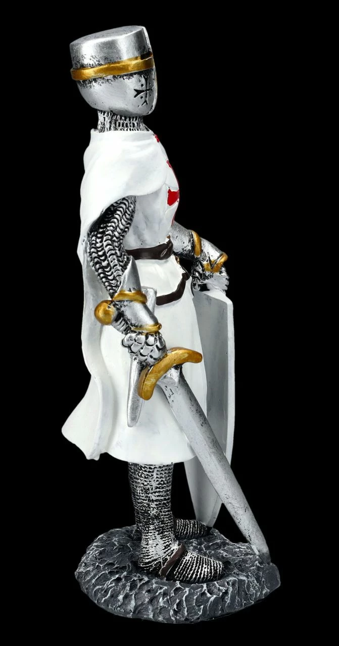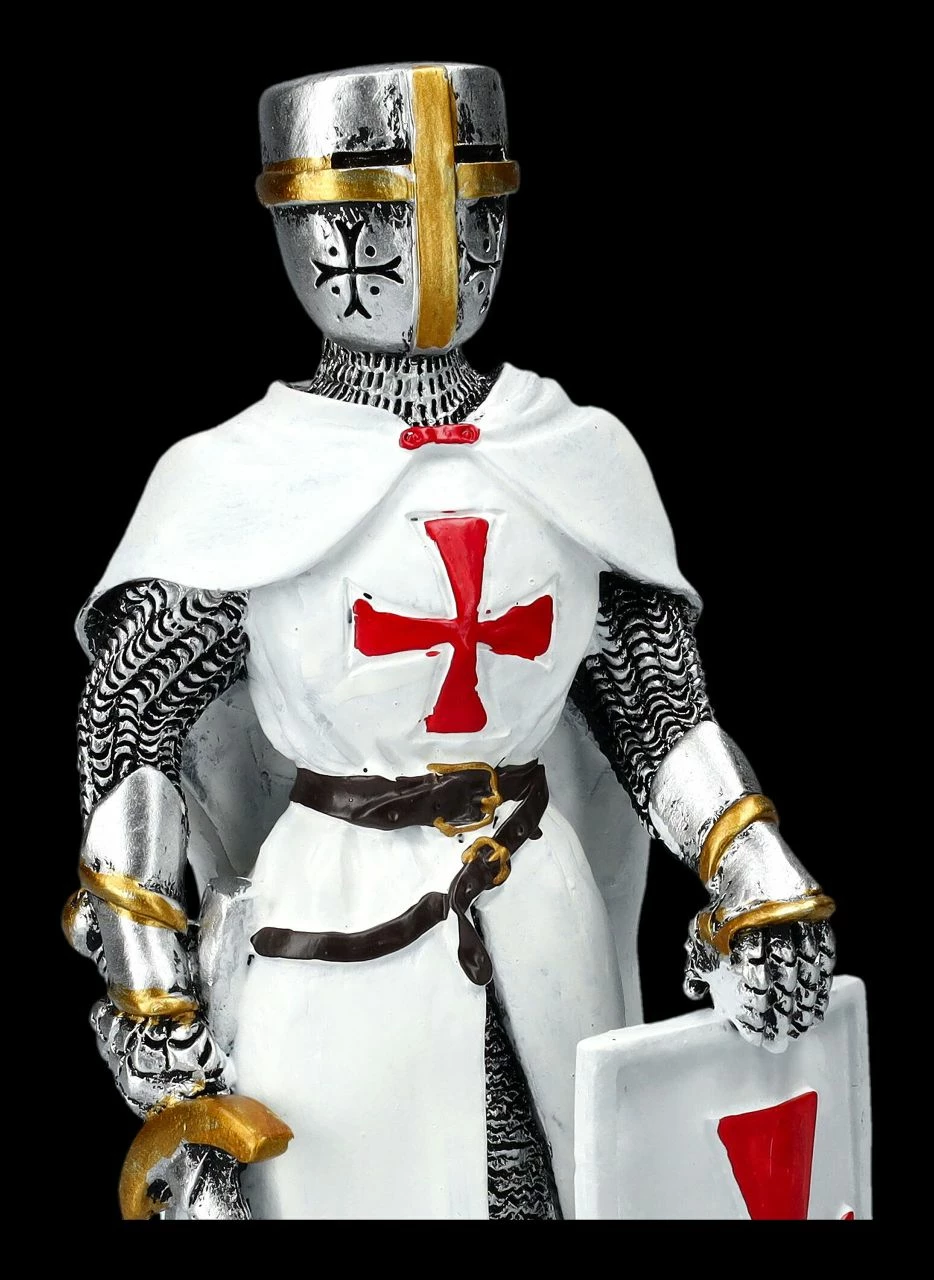 Ein perfektes Geschenk für Ritter ist dieser Kreuzritter in voller Rüstung. Der weiße Umhang und auch sein weißes Schild in der linken Hand tragen ein rotes Kreuz und der silberfarbene Helm ist mit einem goldenen Kreuz verziert. In der rechten Hand hält er sein Schwert friedlich zu Boden gerichtet. Die detailreiche Ritter Figur in Weiß und Rot wurde sorgfältig aus Kunststein (Polyresin) gefertigt und von Hand bemalt. Der Kreuzritter mit Schild und Schwert ist 21 cm hoch, 9 cm breit und 8 cm tief und eine fantastische Ergänzung jeder Ritter-Sammlung.