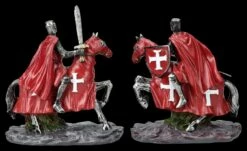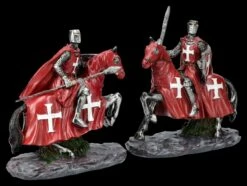 Eine prächtige Szene – zwei Kreuzritter mit weißen Kreuzen auf leuchtend roten Umhängen über ihren Rüstungen reiten gemeinsam in den Kampf. Auch ihre Pferde tragen rote Decken mit weißen Kreuzen. Einer der beiden Ritter trägt sein erhobenes Schwert in der rechten Hand und der andere Ritter seinen Speer, der übrigens zum Stecken ist. Die beiden Kreuzritter auf ihren Pferden sind detailreich aus Kunststein (Polyresin) gefertigt und 12,5 – 13,5 cm hoch, 11 – 11,5 cm breit und 5,5 – 6 cm tief. Ein tolles 2-er Set – vielleicht auch für ein Diorama – das jeden Sammler begeistern wird.