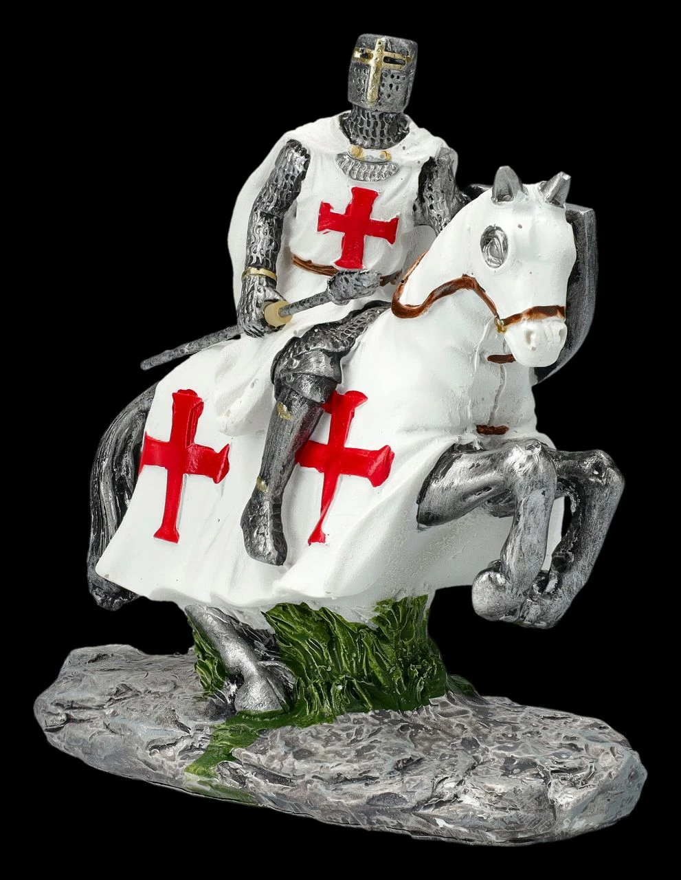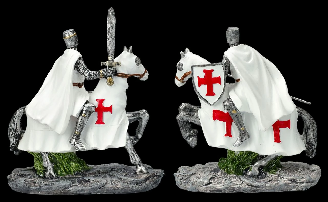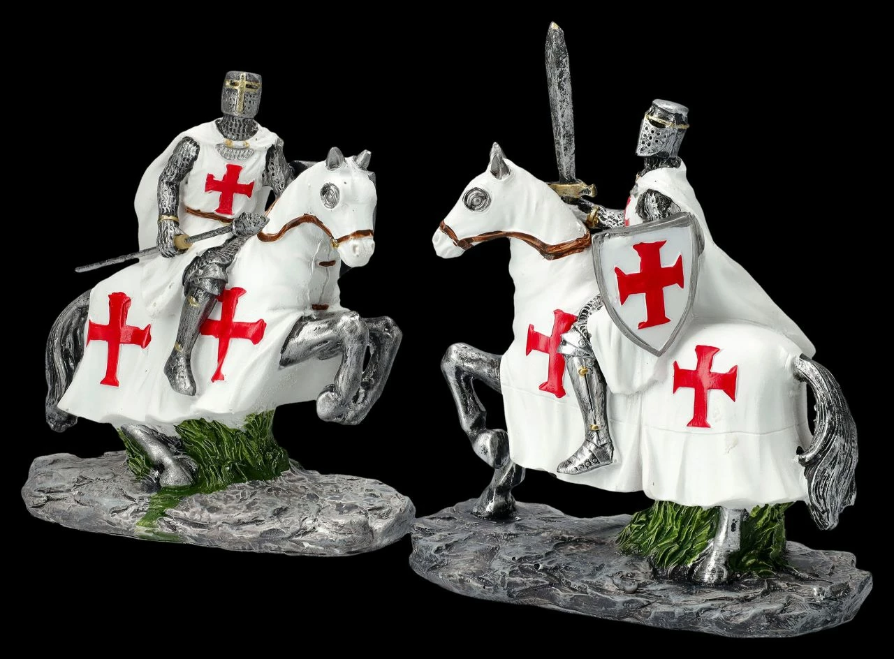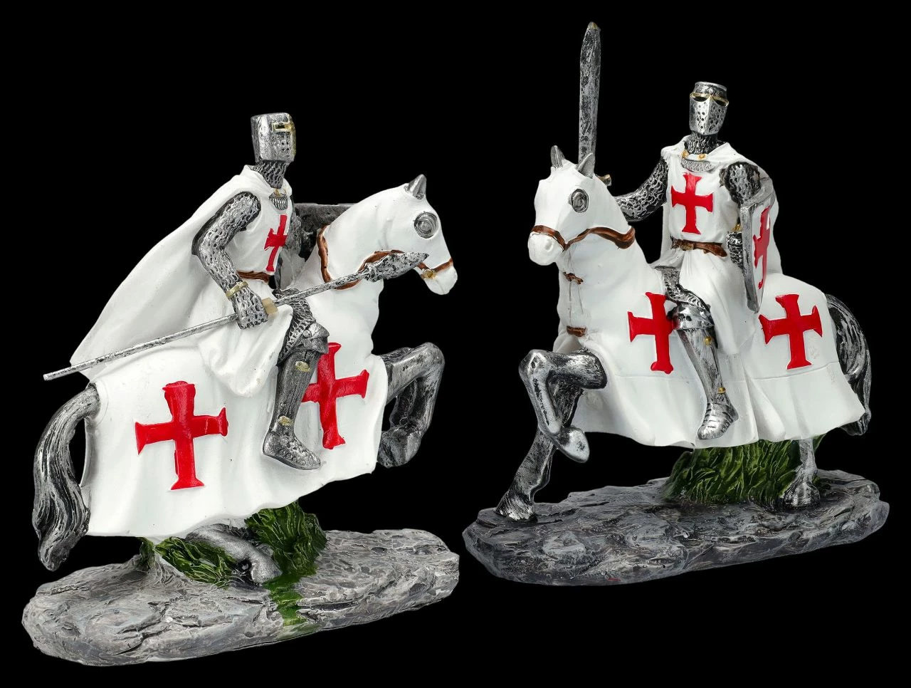 Zwei Kreuzritter mit roten Kreuzen auf ihren weißen Umhängen über ihren Rüstungen reiten gemeinsam in den Kampf. Auch ihre Pferde tragen weiße Decken mit roten Kreuzen. Einer der beiden Ritter trägt sein erhobenes Schwert in der rechten Hand und der andere Ritter einen Speer, der übrigens zum Stecken ist. Die beiden Kreuzritter auf ihren Pferden sind detailreich aus Kunststein (Polyresin) gefertigt und 11 – 135 cm hoch, 11 – 11,5 cm breit und 6 cm tief. Das fantastische 2-er Set ist perfekt geeignet, ein Diorama zu ergänzen. Es ist aber auch ein prächtiges Geschenk, das sicher jeden Sammler begeistern wird.