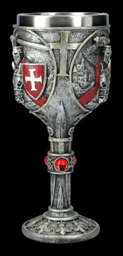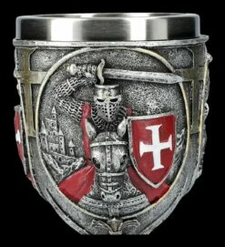 Dieser edle Ritter Kelch wirkt wie aus Eisen geschmiedet. Der mit roten Steinen geschmückte Stiel steht auf einer mit Lilien verzierten Basis und zeigt eine nach unten gerichtete Schwertspitze. Auf der Vorder- und der Rückseite sieht man vor einer Burg einen Kreuzritter auf seinem Pferd mit erhobenem Schwert bei seinem ersten Kampf. Er trägt einen leuchtend roten Umhang und sein Schild mit weißem Kreuz auf rotem Hintergrund, der die Szene dramatisch wirken lässt. Der prächtige Ritter-Kelch ‚First Knight‘ ist detailreich aus handbemaltem Kunststein (Polyresin) gefertigt und hat zur leichteren Reinigung einen herausnehmbaren Einsatz aus Edelstahl mit einem Fassungsvermögen von 200 ml. Der großartige Kelch ist 18 cm hoch, 7,5 cm breit und 8 cm tief und ein perfektes Geschenk für einen Ritter. Er ist aber natürlich auch als Preis für ein Ritterturnier wunderbar geeignet.
