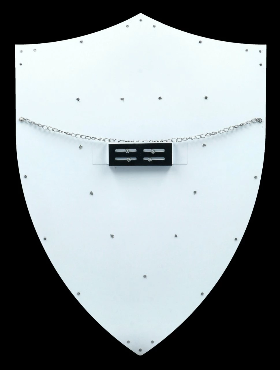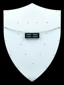 Dieses wunderschöne weiße Ritter Schild mit der silberfarbenen Einfassung hat eine außerordentlich edle Wirkung. Auf dem Wappen in der Mitte sind drei Löwen auf wie aus gehämmertem Metall gefertigten Grund angebracht. Das edle Schild ist aus Metall gefertigt und hat eine Höhe von 63 cm, eine Breite von 45 cm und eine Tiefe von 4 cm. Es ist zum Hängen. Das tolle Schild mit dem Drei Löwen Wappen ist eine wunderbare und stilvolle Dekoration für jeden Ritter und auch ein tolles Geschenk für alle Mitelalter Fans.