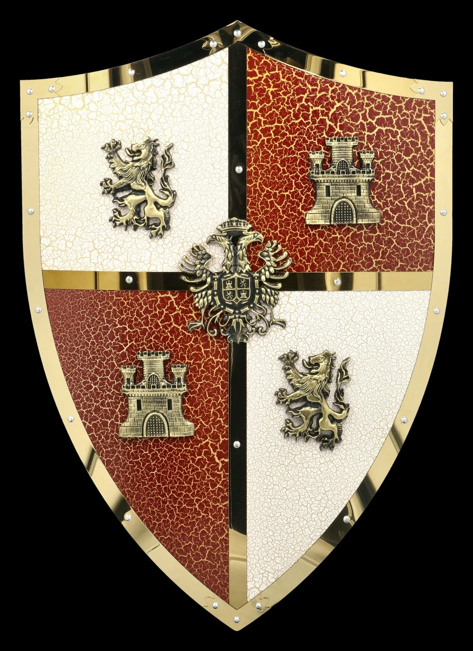 Eine wunderbare und stilvolle Dekoration für jeden Ritter ist dieses wunderschöne Ritter Schild mit zwei silberfarbenen Löwen auf weißem Grund und zwei Burgwappen auf rotem Grund. Das tolle Schild mit dem Doppeladler in der Mitte ist aus Metall gefertigt. Das Ritter Schild hat eine Höhe von 63 cm, eine Breite von 45 cm und eine Tiefe von 4 cm und es ist zum Hängen.Das tolle Ritter Schild ist außerordentlich dekorativ und auch ein ganz besonderes Geschenk für alle Mitelalter Fans.