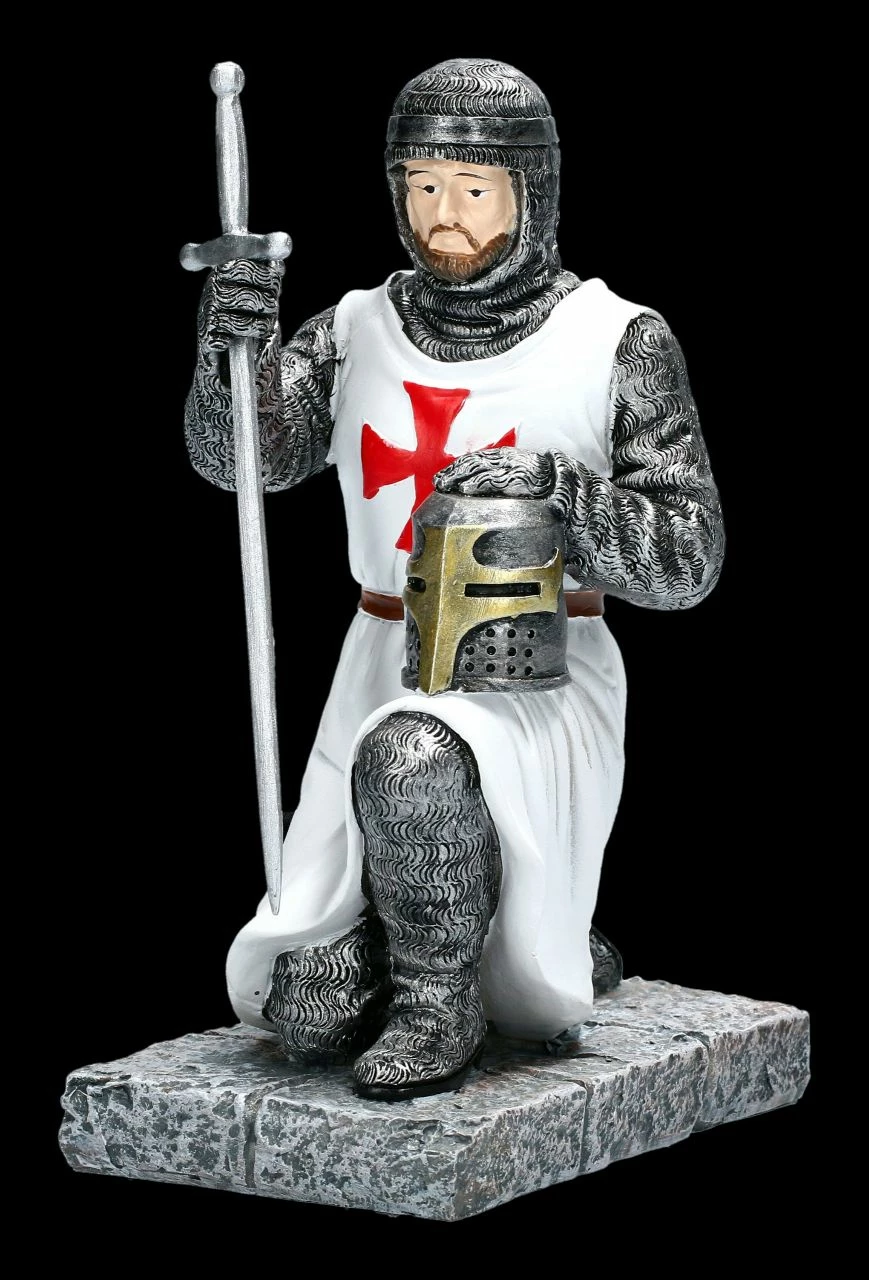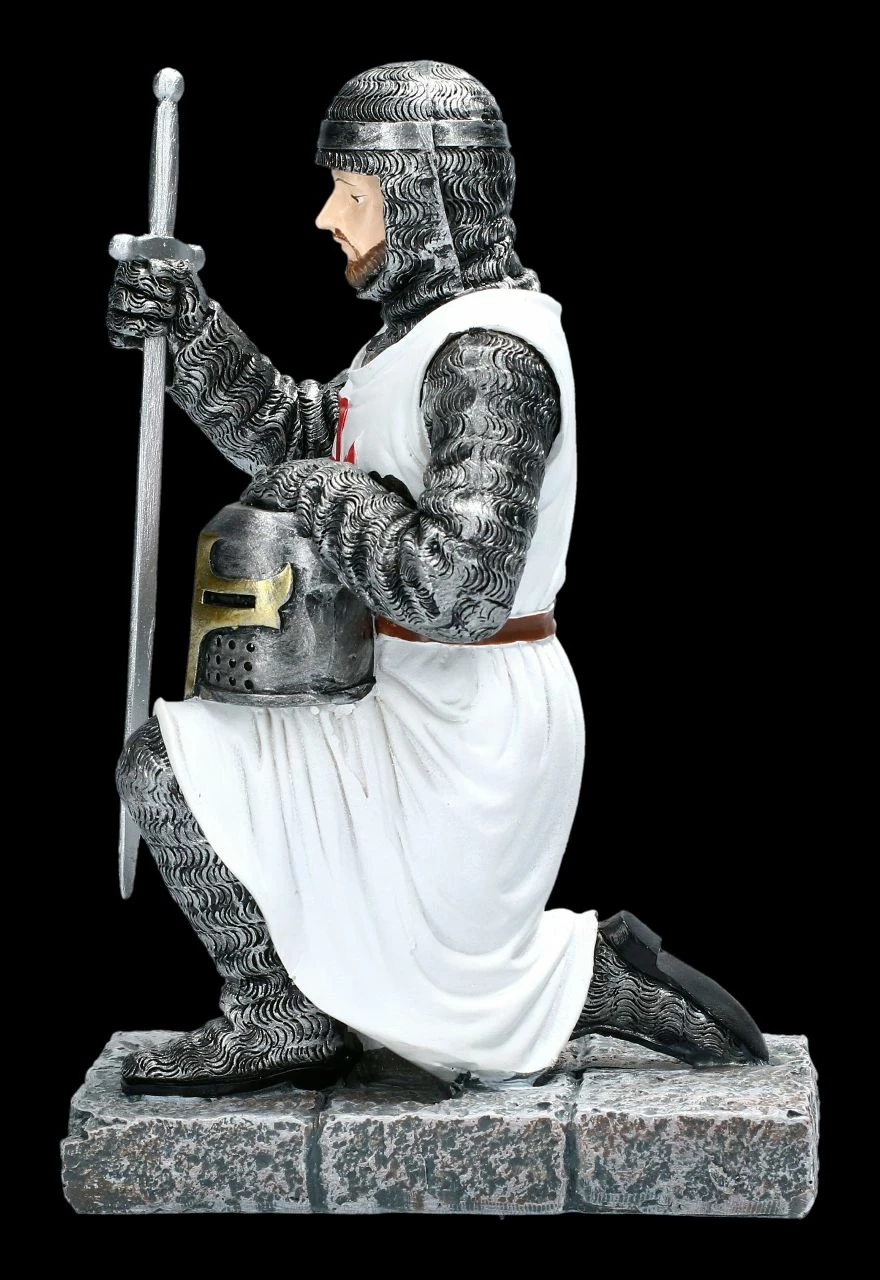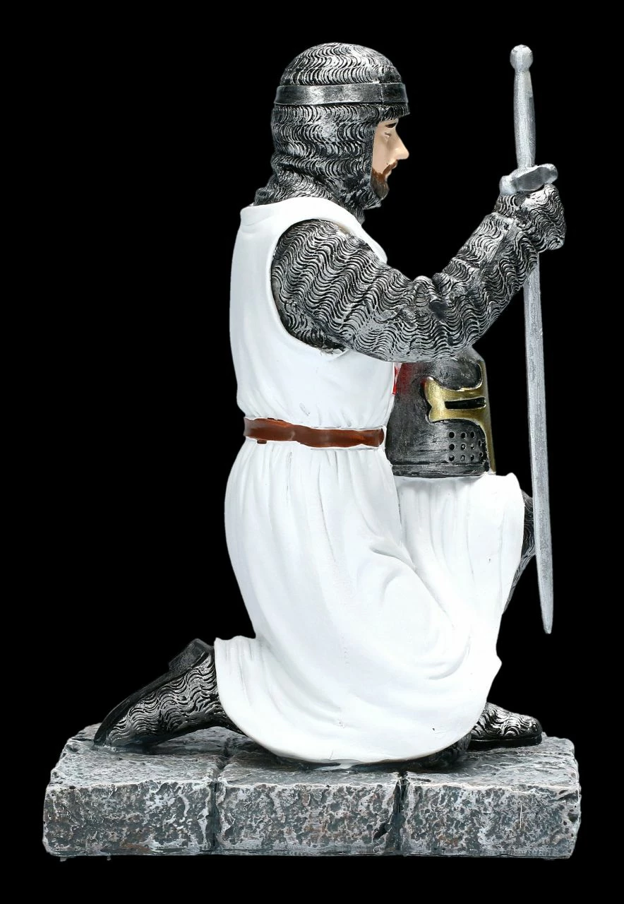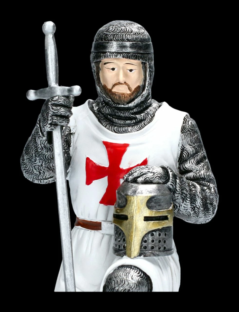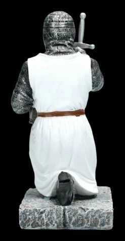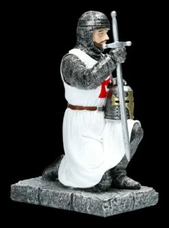 Seinen Helm auf das linke Knie gelegt und das Schwert in der rechten Hand, kniet der Kreuzritter ergeben vor seinem Herrn. Die knieende Ritterfigur ist detailreich aus handbemaltem Kunststein (Polyresin) gefertigt. Sie ist 16,5 cm hoch, 7 cm breit und 11 cm tief. Das Schwert ist zum Stecken. Über diesen Kreuzritter als Geschenk freut sich sicher jeder Sammler von Ritterfiguren.