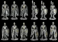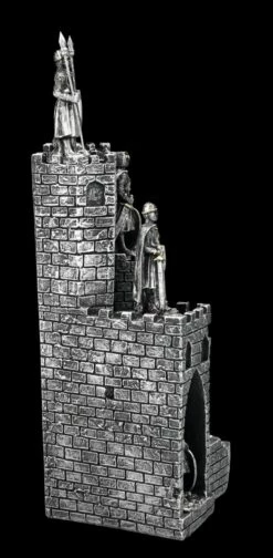 Ein fantastisches Geschenk für große und kleine Ritterfreunde.ist diese wunderbare Ritterburg aus handbemaltem Kunststein (Poloyresin). Hier können die 12 Ritter, die mit dieser schönen Burg gleich mitkommen, den ihnen gebührenden Platz einnehmen und ihren König beschützen. Die Ritterfiguren in ihren silberfarbenen Rüstungen mit goldfarbenen Kreuzen wurden detailreich aus handbemaltem Kunststein (Polyresin) gefertigt. Sie sind 7,5 – 8,5 cm hoch, 3,5 – 4 cm breit und 3 – 3,5 cm tief und passen perfekt auf diese großartige Ritterburg. Das 24 cm hohe, 24 cm breite und 13 cm tiefe Ritterburg-Display ist nicht nur sehr dekorativ, es nimmt auch nicht allzuviel Platz ein.