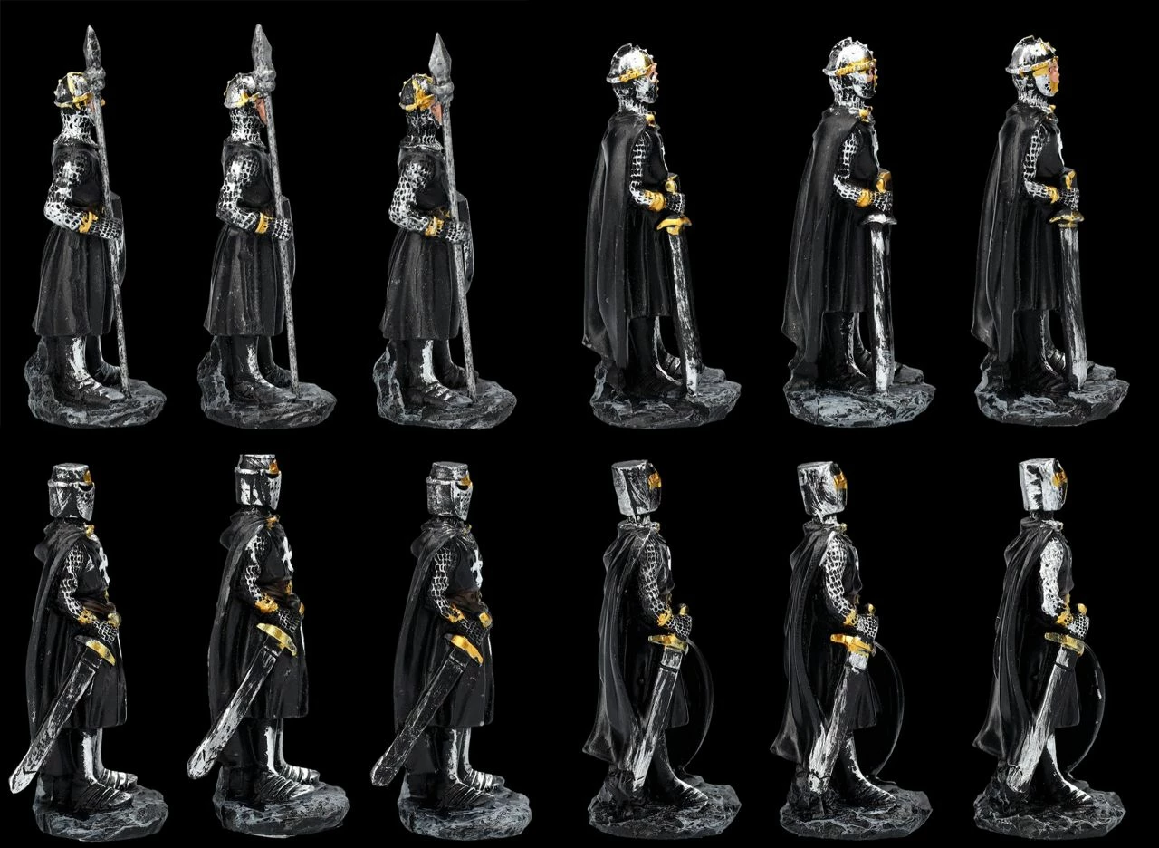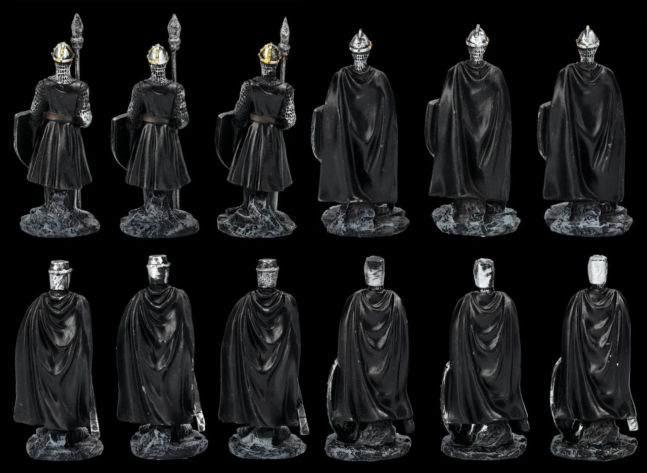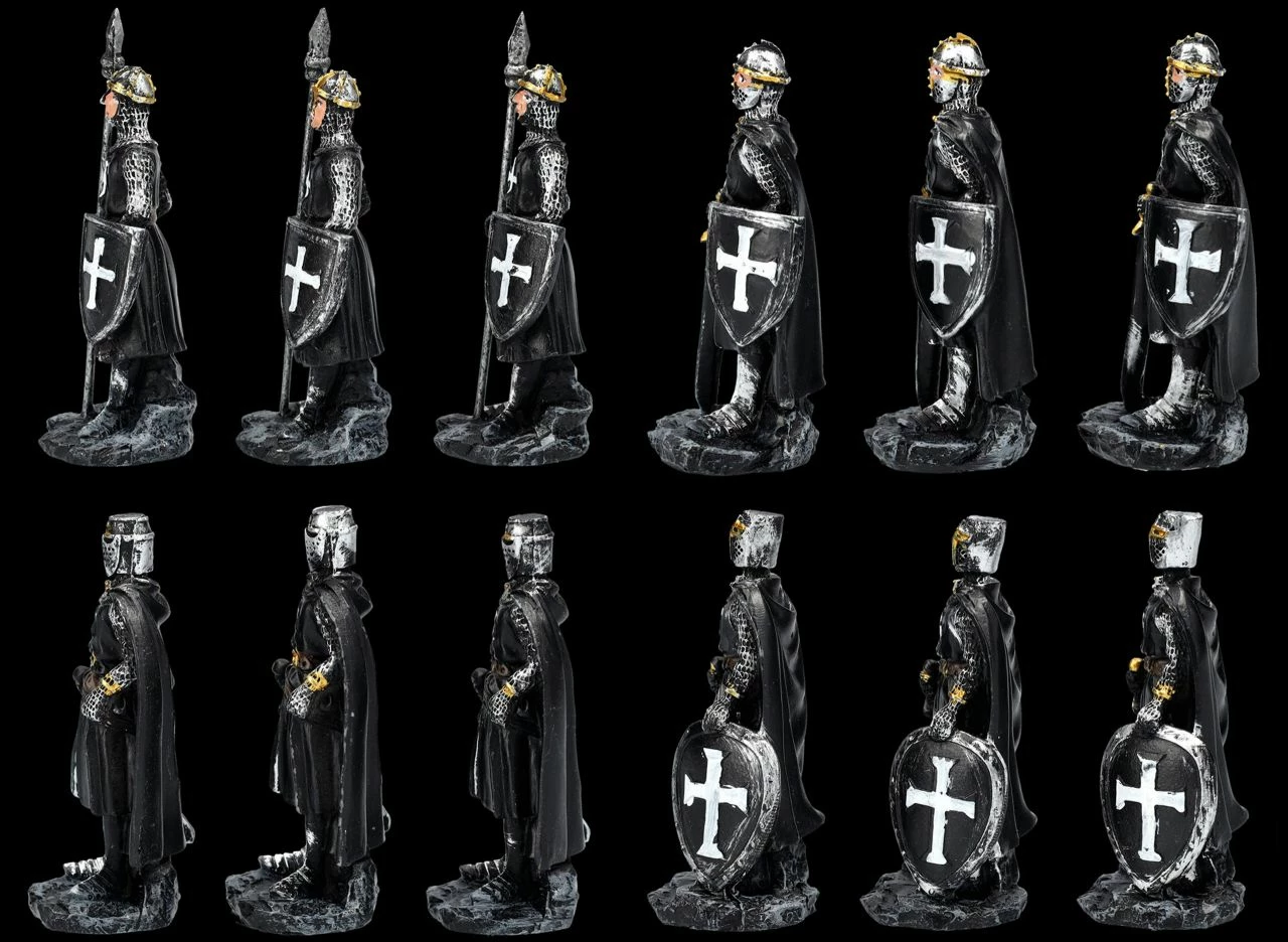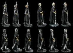 In schwarzer Rüstung mit weißen Kreuzen wurden die 12 unterschiedlichen Kreuzritter mit goldfarbenen Akzenten handbemalt. Die schwarzen Ritterfiguren wurden detailreich aus Kunststein (Polyresin) gefertigt und sind 7,5 – 8,5 cm hoch, 3,5 – 4,5 cm breit und 3 – 3,5 cm tief. Sie sind ein tolles Geschenk für jeden Ritter-Fan, der sich über die Kreuzritter in schwarzer Rüstung im 12er Set sicher freuen wird. Gemeinsam mit den silberfarbenen und den weißen Ritterfiguren aus dieser Serie können die 12 schwarzen Kreuzritter eine ganze Ritterlandschaft bereichern.