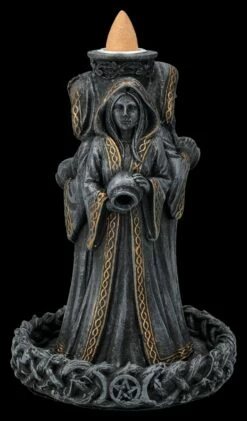 Bereits seit Urzeiten wird die Dreifaltige Göttin in vielen Darstellungen verehrt. Im antiken Griechenland wurde die Dreifaltige Göttin der Magie Hekate genannt, die heute noch in der Wicca-Symbolik eine sehr große Rolle spielt. Bei diesem wunderbar handbemalten Rückfluss-Räucherhalter aus Kunststein (Polyresin) steht die dreifaltige Göttin Hekate als Jungfrau, Mutter und Alte Frau in einem verzierten Becken. Alle drei Darstellungen der Hekate halten Gefäße in den Händen. Auf ihren Köpfen tragen sie einen Kessel, in dem der Räucherkegel Platz findet. Sobald der Räucherkegel angezündet wird, strömt der Rauch in das Becken zu ihren Füßen und hüllt alles in einen mystischen Nebel. Der 16 cm hohe, 11 cm breite und 11 cm tiefe Backflow Räucherhalter ist wunderbar für jedes Wicca-Ritual geeignet und damit auch ein magisches Geschenk. 3 Backflow-Räucherkegel sind in der Lieferung enthalten und weitere finden Sie in unserem Shop. Bitte beachten Sie unsere Sicherheitshinweise zu dem Rückfluss-Räucherhalter.