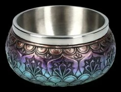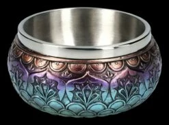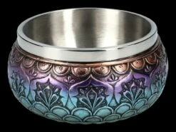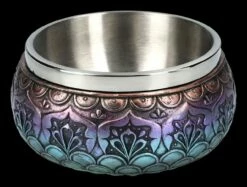 Die Farben und Muster machen aus der 8 cm hohen, 14 cm breite und 14 cm tiefen Räucherschale ‚Mandala‘ aus handbemaltem Kunststein (Polyresin) ein wunderschönes Accessoire. Auf dieser schönen Schale zeigt sich das Mandala als Dreieck, die als Trinität das gesamte Universum, also Himmel, Erde und Unterwelt darstellen soll..Aber nicht nur für besondere Rituala oder auch beim Yoga ist die Räucherschale geeignet, auch als Snackschale auf dem Tisch ist sie ein außergewöhnlicher Blickfang. Durch den 4,5 cm hohen herausnehmbaren Edelstahleinsatz mit dem Durchmesser von 11 cm und dem Fassungsvermögen von ca. 350 ml kann sie sogar als ganz besondere Futterschale für Katze oder Hund dienen. Auf jeden Fall ist die Räucherschale mit dem Mandala ein sehr vielseitiges Accessoires und damit auch ein wunderbar kraftvolles Geschenk.