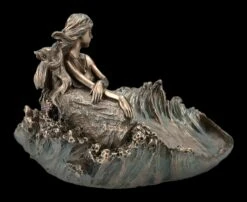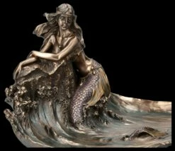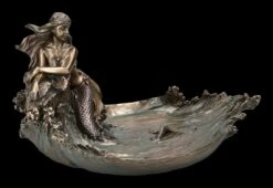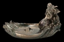 Dass es seit jeher Geschichten über die Gefährlichkeit der schönen Meerjungfrauen gibt, die einen Seemann in die Untiefen der Ozeane locken können, kann man sich bei dieser anmutigen Meerjungfrau gut vorstellen. Umgeben von den Schaumkronen der Meereswogen ruht die Schöne lässig an einem Felsen angelehnt. Verführerisch lächelnd scheint sie mit ihrem Fischschwanz die Wellen spielerisch aufzupeitschen. Die edel bronzierte und fein colorierte Schale mit der aparten Schönen erinnert an die kunstvollen Arbeiten der Jugendstilzeit. Die herrliche Schale wurde aus hochwertigem, feinem Kunststein (Polyresin) gefertigt. Sie stammt aus der Studio Collection von Veronese und ist 16 cm hoch, 28,5 cm breit und 22,5 cm tief. Ob auf einem Sideboard, einem Tisch oder als Schmuckelement in einem Bad – diese herrliche Schale wird überall zum Blickfang und ist damit auch ein wunderbar dekoratives Geschenk für jeden, der sich gerne mit schönen Dingen umgibt.