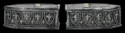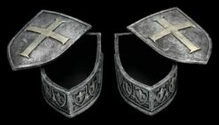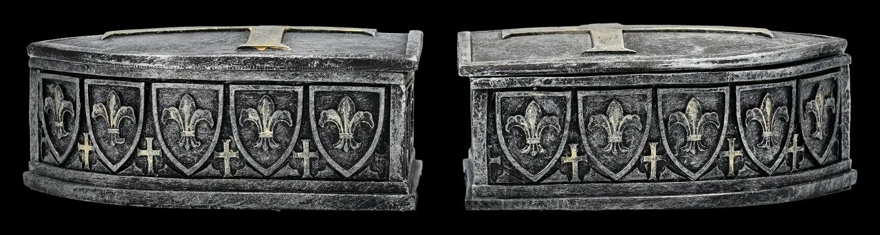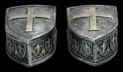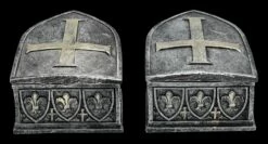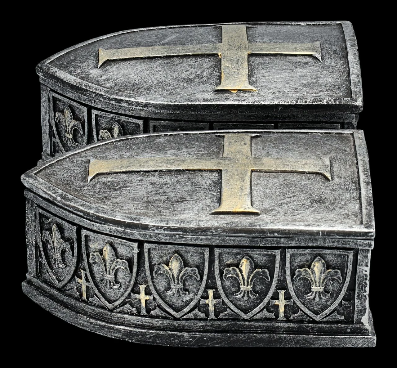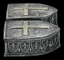 Die beiden mit Wappen verzierten Schatullen in Form eines Schildes mit einem Ritterkreuz auf dem Deckel wirken wie aus altem Eisen geschmiedet. Sie sind aus handbemaltem Kunststein (Polyresin) gefertigt und je 4,5 cm hoch, je 8 cm breit und je 12 cm tief. Innen haben die Schatullen mit H 3,5 cm x B 6,5 cm x T 10,5 cm Platz, um kleine Erinnerungen, Karten zu einem Ritterturnier oder auch das eine oder andere Schmuckstück aufzubewahren. Die Schatulle mit dem Kreuzritter-Schild ist das richtige Geschenk für kleine und große Ritter. Es kommt im 2er Set und kann am besten gleich mit einem Ritterfreund geteilt werden.