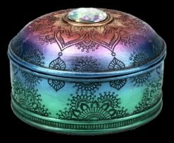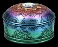 Die wunderschön in zarten Farben handbemalte Schatulle mit dem Mandala auf dem Deckel und einem schönen Schmuckstein in der Mitte ist die perfekte Aufbewahrung für besonderen Schmuck. Die bezaubernde Schatulle ist sorgsam aus Kunststein (Polyresin) gefertigt. Sie hat eine Höhe von 6 cm und einen Durchmesser von 10 cm. Innen hat die aparte Schatulle mit dem Mandala die Maße H 3,5 cm / D 9 cm und ist damit auch als Verpackung für ein besonderes Geschenk sehr gut geeignet.