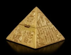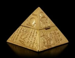 Kleine Kostbarkeiten und Ihre wichtigsten Erinnerungsstücke finden Platz in dieser kleinen goldfarbenen Pyramide mit Klappdeckel. Die Pyramide aus handbemaltem Kunststein (Polyresin) ist rundherum mit Hieroglyphen verziert. Das schwarze Innere hebt sich wundervoll vom goldfarbenen Äußeren ab.