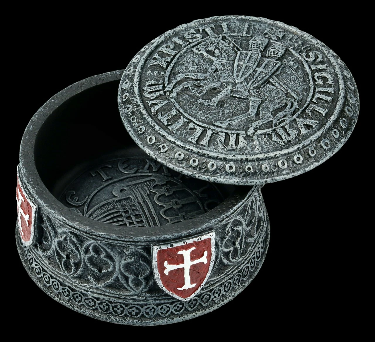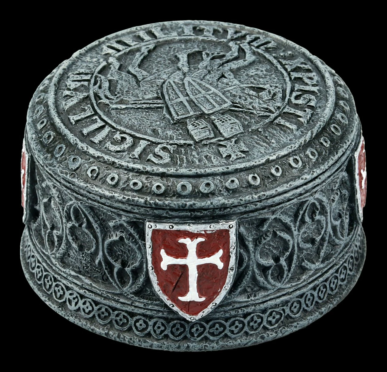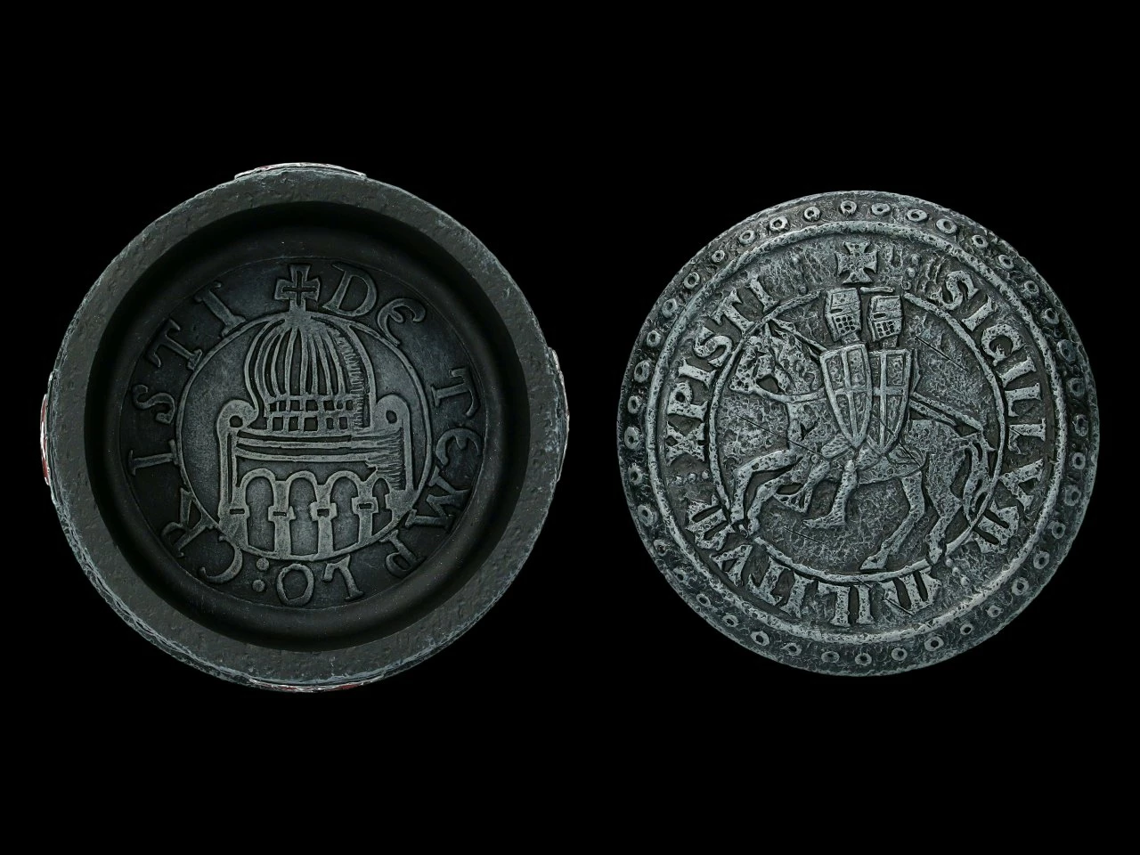 Die edle Tempelritter Schatulle mit dem Sigillum Militum Xpisti aus der Serie Studio Collection von Veronese zeigt das Siegel der Ritter Christi. Sie ist sehr detailreich aus handbemaltem Kunststein (Polyresin) gearbeitet und hat eine Höhe von 5,5 cm, eine Breite von 10 cm und eine Tiefe von 10 cm. Eine faszinierende Schatulle, die auch als Verpackung für ein besonderes Geschenk für jeden Ritter gut geeignet ist.