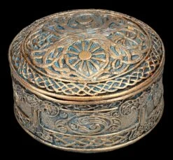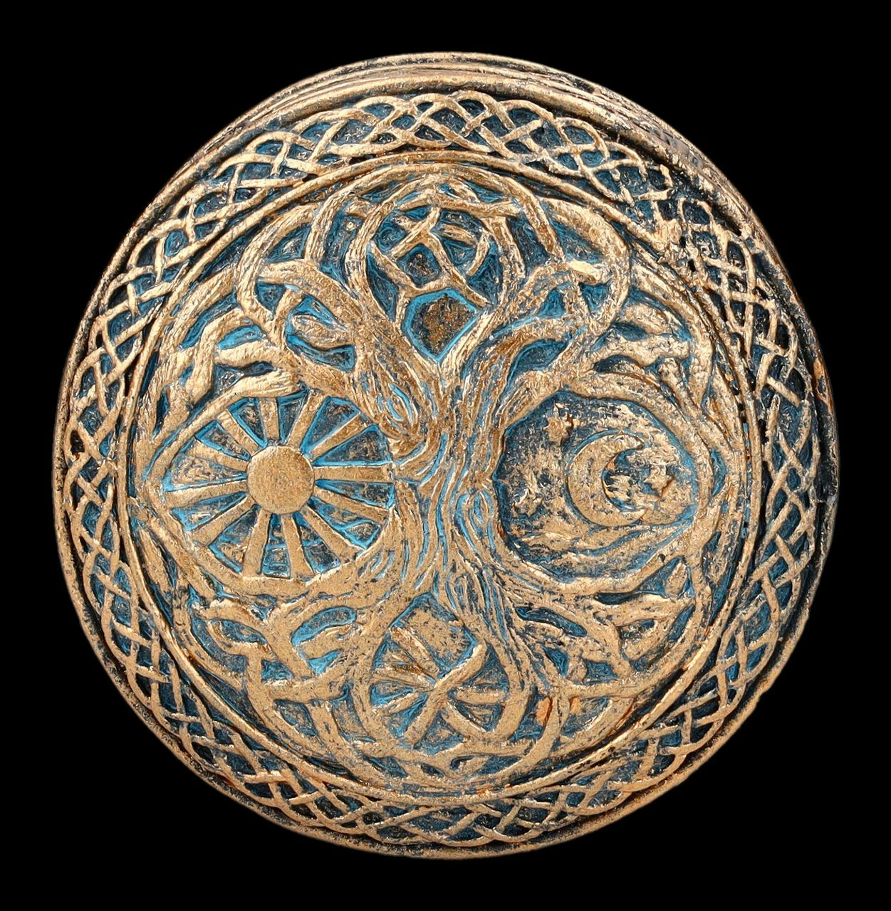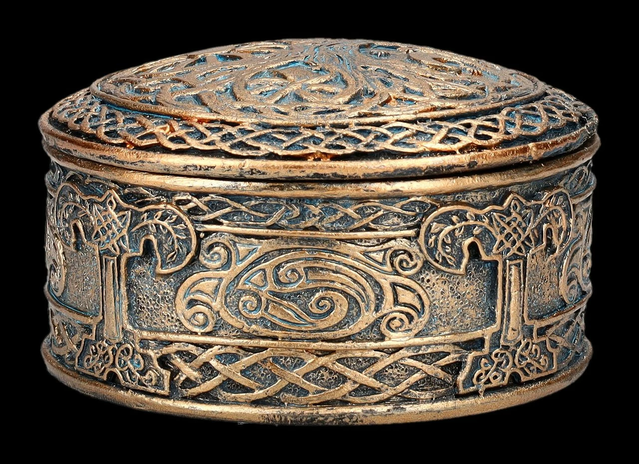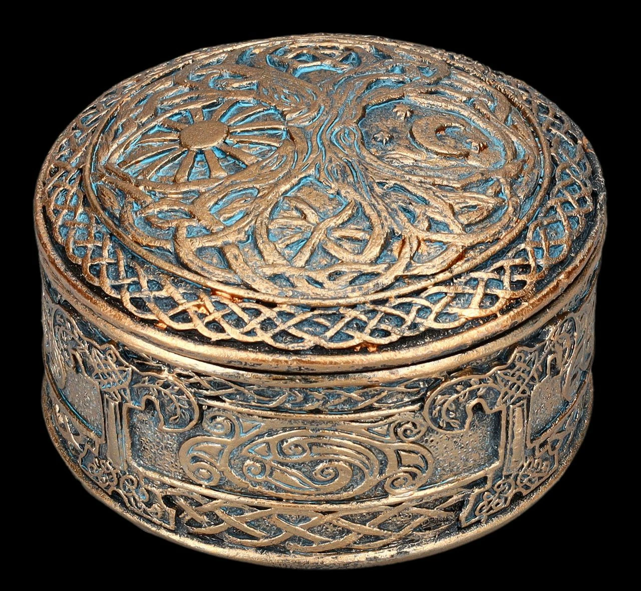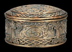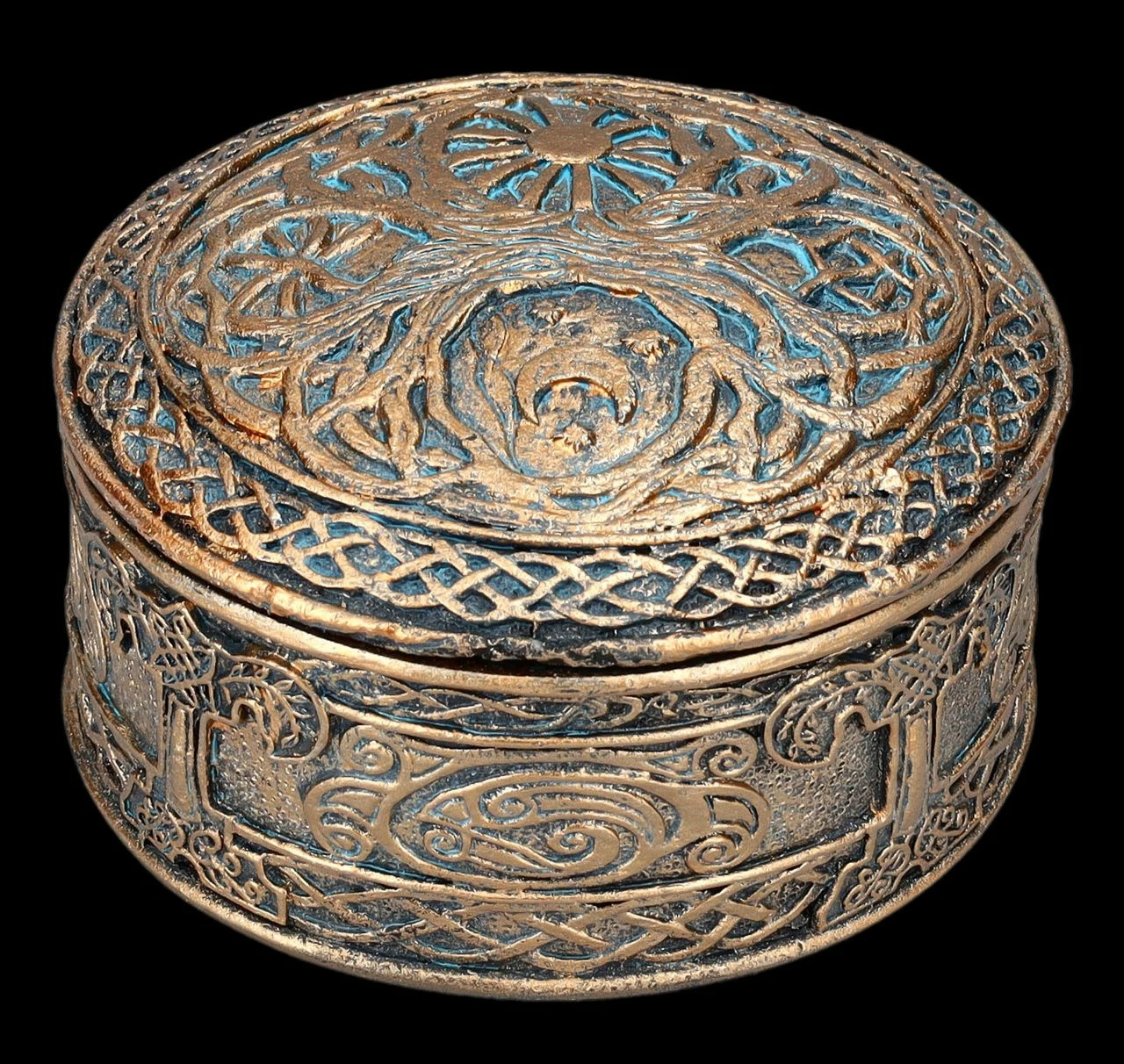 Yggdrasil, der Weltenbaum der Germanen, ziert neben zahlreichen nordischen Insignien diese edle Schatulle. Sie wurde außerordentlich detailreich aus fein handbemaltem Kunststein (Polyresin) gefertigt. Die 6,5 cm hohe Schatulle mit dem Durchmesser von 11 cm ist ein fantastisches Geschenk, sie kann aber auch wunderbar zum Beispiel als Verpackung für ein Schmuckstück dienen. Innen hat die herrliche Schatulle mit der Höhe von 4 cm und dem Durchmesser von 8,5 cm Platz für ein besonderes Kleinod.