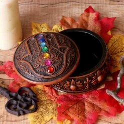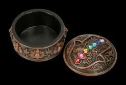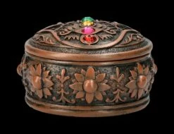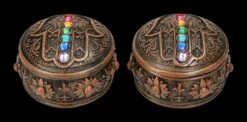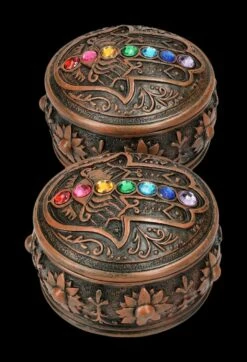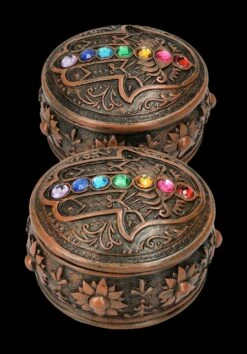 Die mit Schmucksteinen in den Chakrafarben geschmückte Hand der Fatima und die zahlreichen kupferfarbenen Verzierungen auf dunklem Hintergrund machen aus diesen beiden Schatullen mit den Innenmaßen H: 3,5 cm x Durchmesser 9,5 cm die perfekte Aufbewahrung für Kleinigkeiten, die Ihnen besonders am Herzen liegen. Die beiden jeweils 6 cm hohen Schatullen aus handbemaltem Kunststein (Polyresin) mit dem Durchmesser von 9,5 cm sind auch als liebevolle Verpackung für ein besonderes Geschenk bestens geeignet.