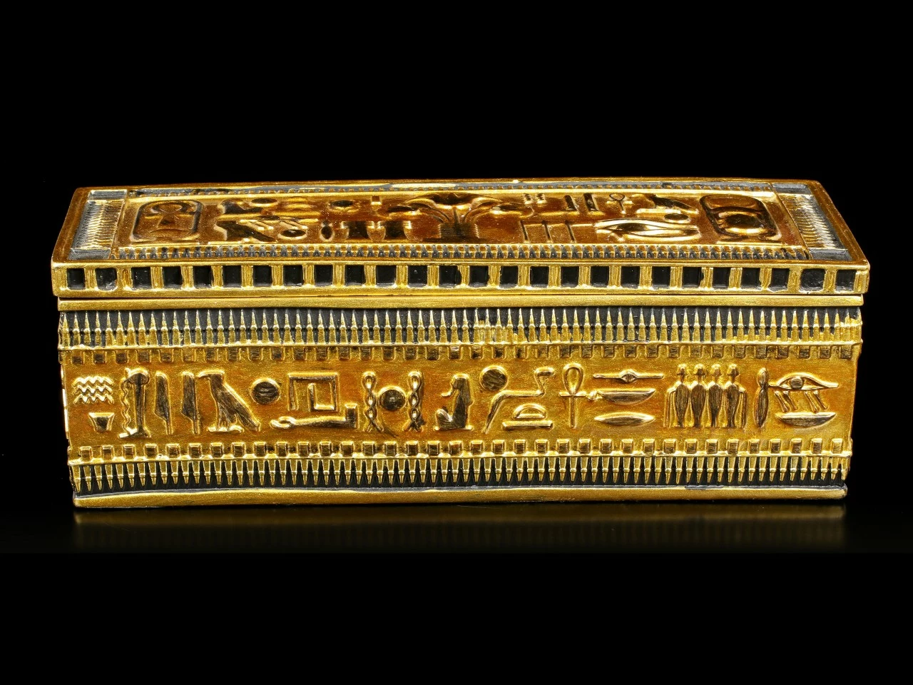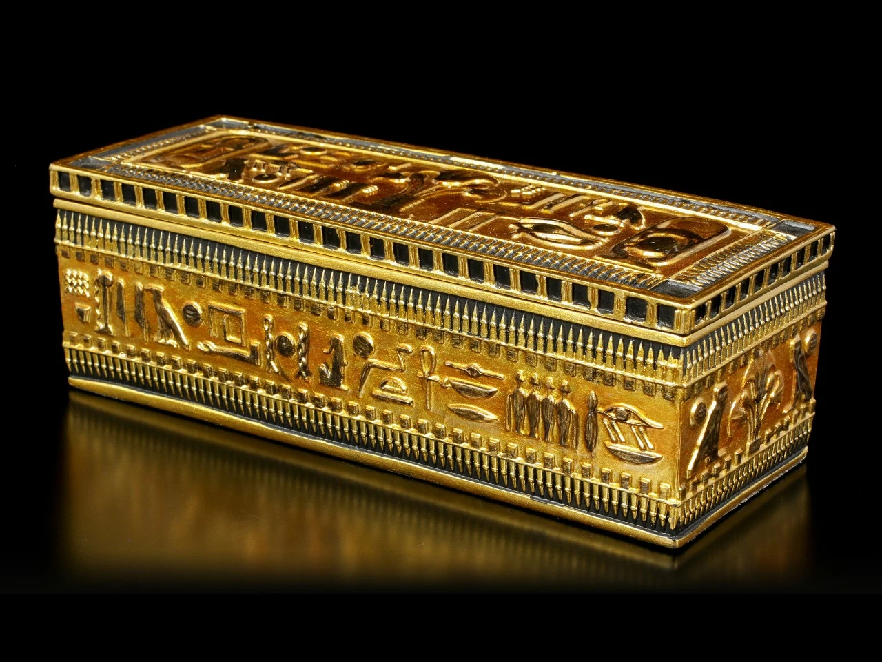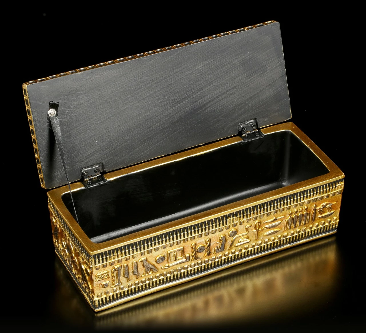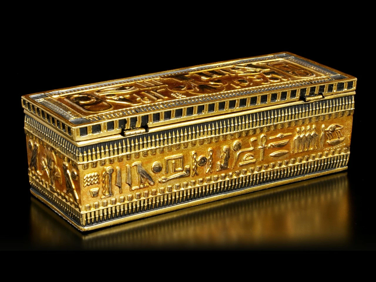 Die edle Schmuckschatulle aus der Serie Ancient Egypt ist für jeden Liebhaber der ägyptischen Kultur ein Highlight. Die goldfarbene Schatulle aus Kunststein (Polyresin) wurde kunstvoll handbemalt und ist ist reliefartig mit Hieroglyphen versehen. Der praktische Klappdeckel schützt Ihren Schmuck und lässt die Schatulle um so dekorativer wirken.