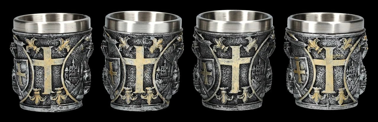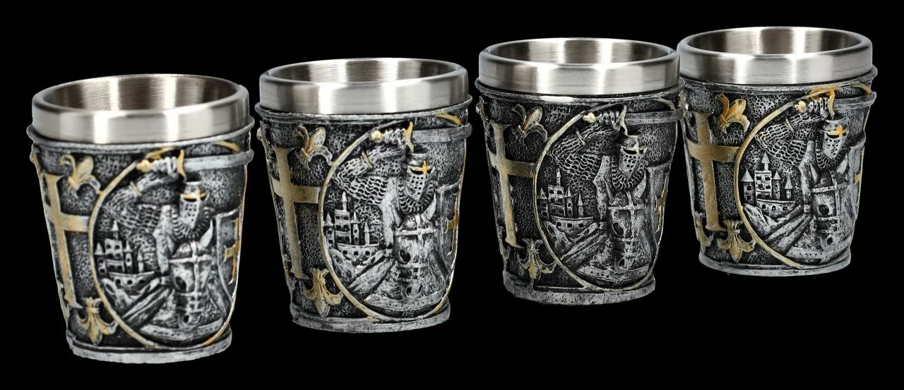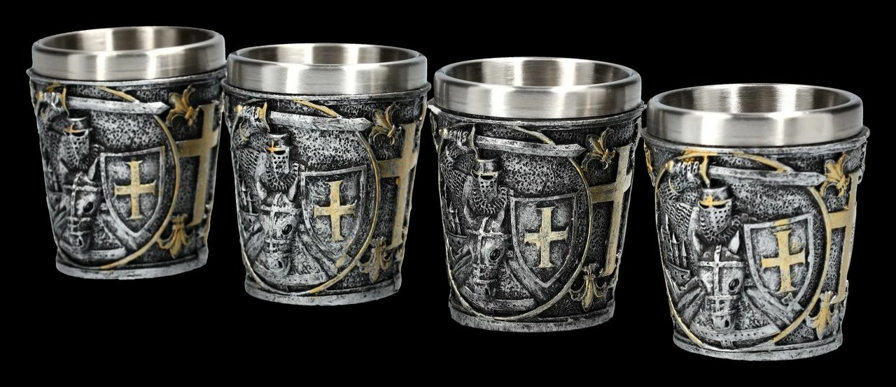 Das Schwert hoch erhoben und das Schild mit dem Kreuz in der Hand kommt der Kreuzritter auf seinem Pferd angestürmt. Die tollen Schnapsbecher mit den reitenden Kreuzrittern kommen im 4er Seit, sind also perfekt, um gleich mit Ritterfreunden auf ein gewonnenes Turnier anzustoßen. Die je 6,5 cm hohen, je 6 cm breiten und je 6 cm tiefen Schnapsbecher aus handbemaltem Kunststein (Polyresin) haben einen Edelstahl.Einsatz mit einem Fassungsvermögen von ca. 80 ml. Sie sind das richtige Geschenk für jeden Ritter und ein perfektes Mitbringsel für die Einladung zu einem Ritteressen.