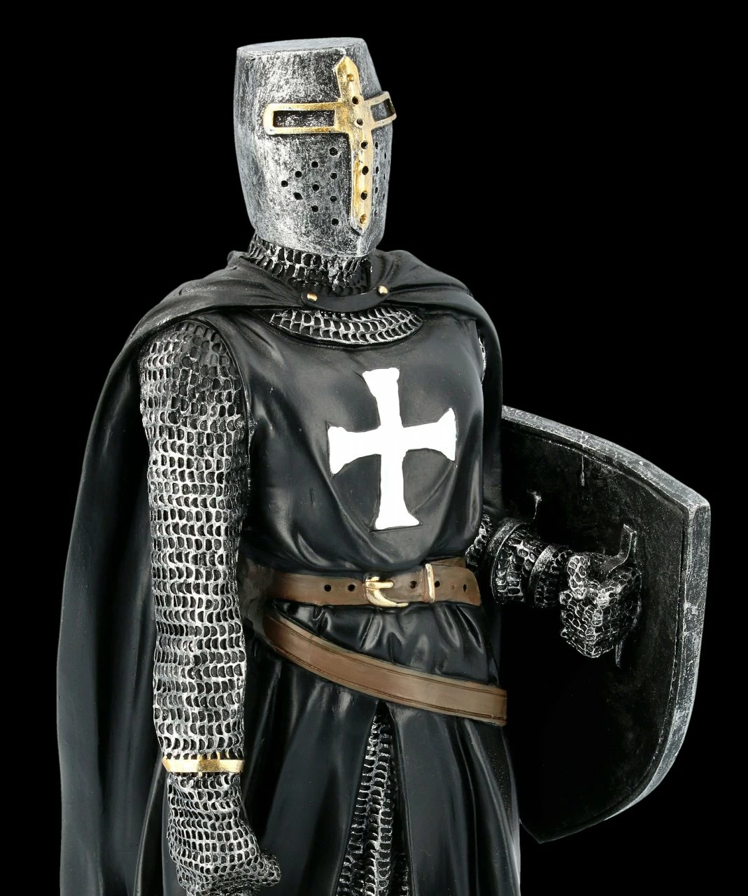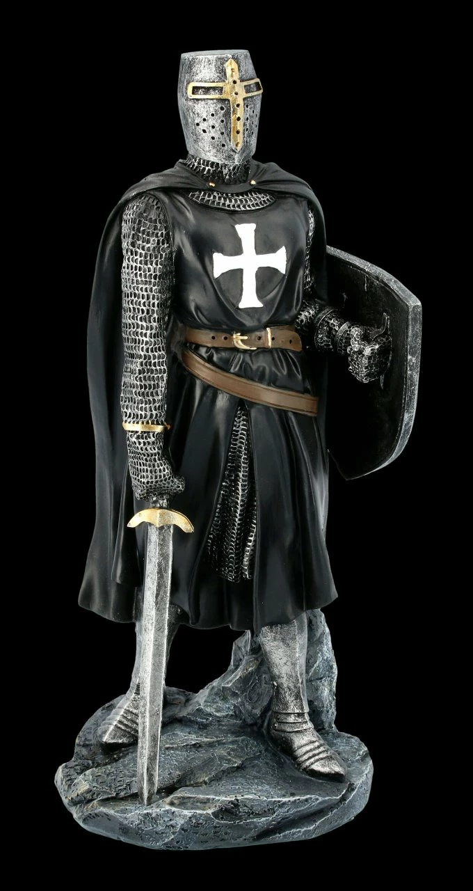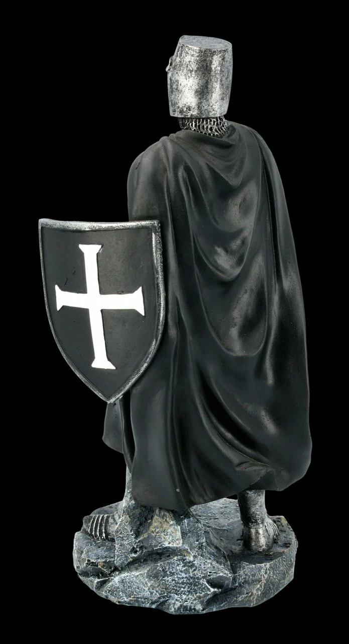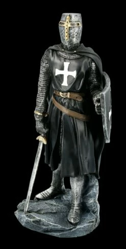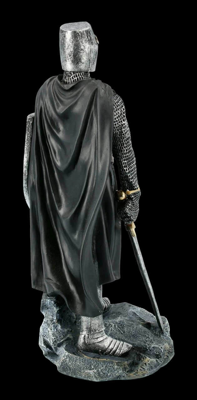 Unglaublich detailreich ist dieser fantastische schwarze Tempelritter mit Schild und Schwert aus Kunststein (Polyresin) gefertigt. Er ist bis zu dem weißen Kreuz auf seiner Brust und dem braunen Ledergürtel mit Sorgfalt handbemalt. Mit seiner aufmerksamen Haltung und dem heruntergelassenen Visier schreckt er als Wache sicher alle Feinde ab. Die schwarze Tempelritter Figur ist mit der Höhe von 30 cm, der Breite von 14,5 cm und der Tiefe von 12 cm ein sehr dekoratives Gechenk für jeden Ritter.