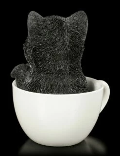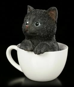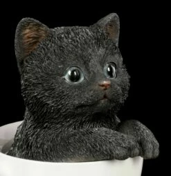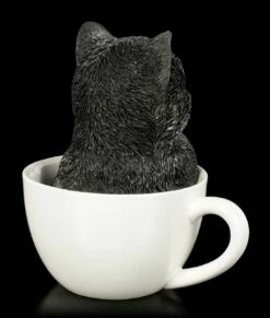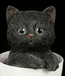 Das schwarze Katzen Kind hat es sich in der weißen Tasse bequem gemacht. Mit großen Augen schaut Ihnen das Kätzchen entgegen und möchte bei Ihnen ein zu Hause finden. Die handbemalte Kunststein (Polyresin) Figur ist ein tolles Geschenk für einen Katzen Fan.