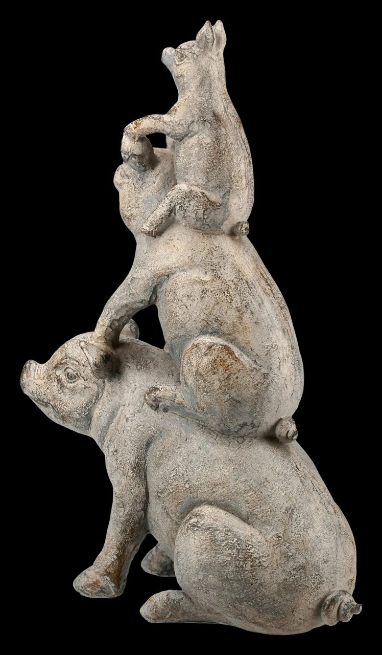 Wenn es den Tieren zu langweilig wird, gibt es Zirkus auf dem Bauernhof und die drei Schweinchen üben schon mal die Pyramiden-Figur. Das kleinste Schweinchen sollte sich aber unbedingt noch besser festhalten. Die lustige Dekofigur mit der Schweine Pyramide hat eine Höhe von 35 cm, eine Breite von 13 cm und eine Tiefe von 24 cm. Sie ist sehr detailreich aus Kunststein (Polyresin) gefertigt und mit großer Sorgfalt liebevoll handbemalt. Die ungewöhnliche und originelle Dekofigur ist ein toller Blickfang im Hofladen eines Bauernhofes, aber auch in jedem anderen Lebensmittel-Laden, oder zum Beispiel auch im Eingangsbereich eines Lokals..